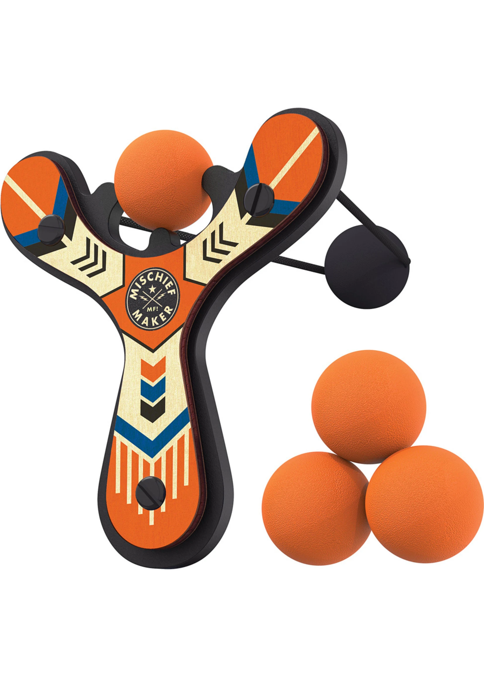 The Slingshot: a truly classic toy. The kind of toy that lets a kid play like a kid. Like the classic, our Mischief Maker Slingshot is handmade from real wood for an authentic feel and is designed to only shoot soft foam balls. The soft foam ball is held in place until shot out of the slingshot. Super easy to use.Â