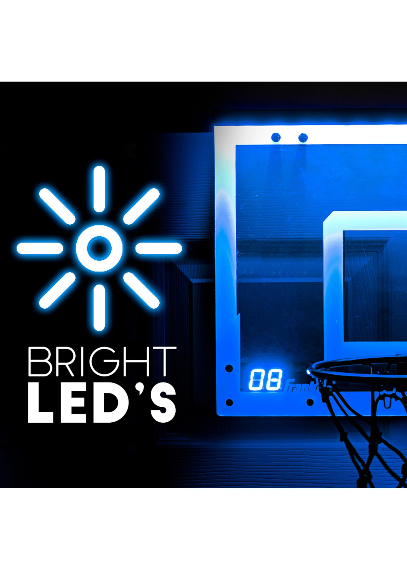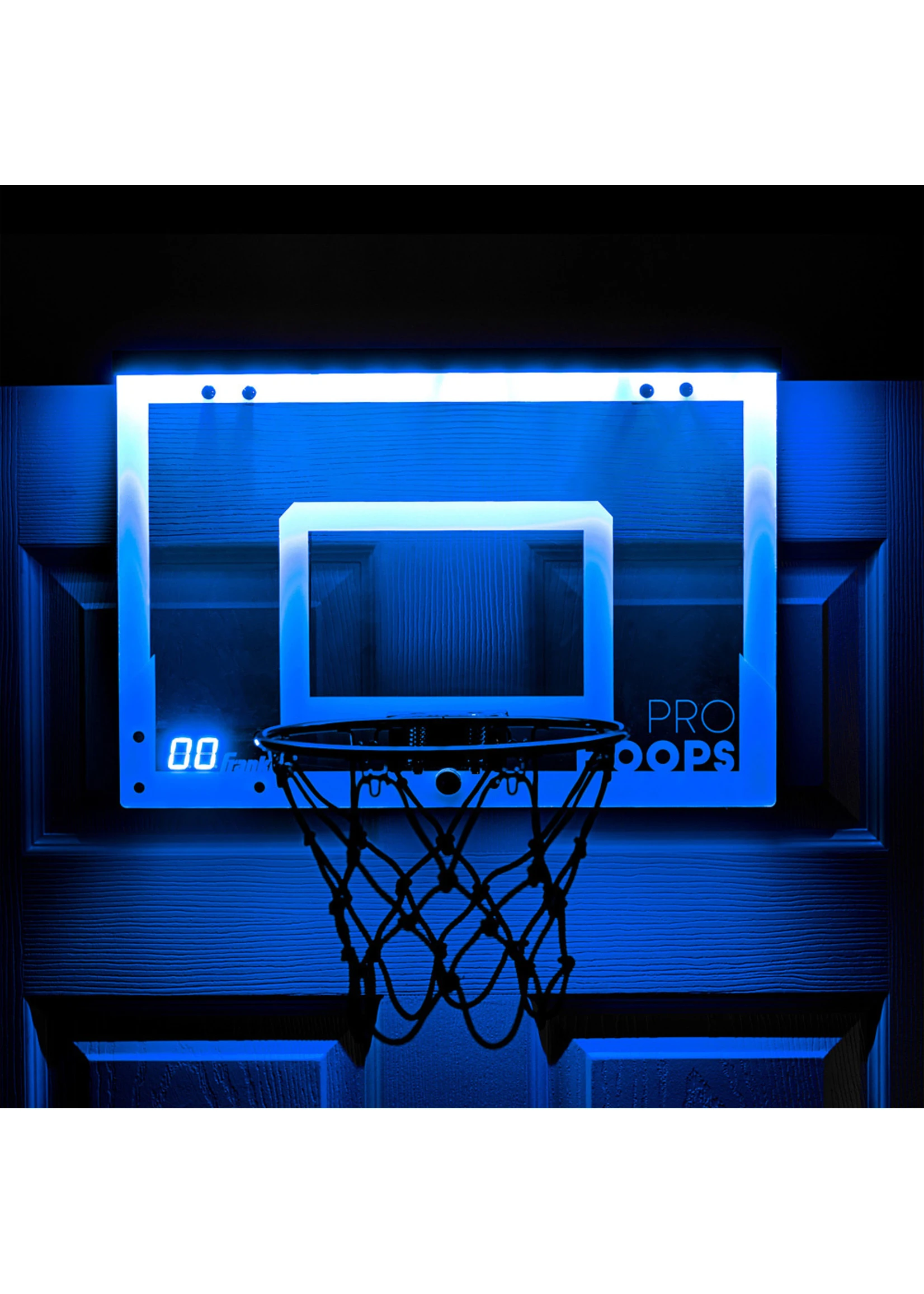 The Franklin Sports LED scoring pro hoops set will have you shooting for 3’s all day. This was designed off of our proven pro classic set. The LED scoring pro hoops is the original over the door basketball set to include a paddle free scoring sensor and LED scoring readout. This means that your friends and family will never miss a shot and have a blast racing the clock to get the highest score! Every basket is followed with fun game room sounds and a flashing LED backboard. Dimly glowing over the door basketball sets are a thing of the past. Step your game up to the bright fun fast-paced exciting game-play of the LED scoring pro hoops from Franklin Sports.
