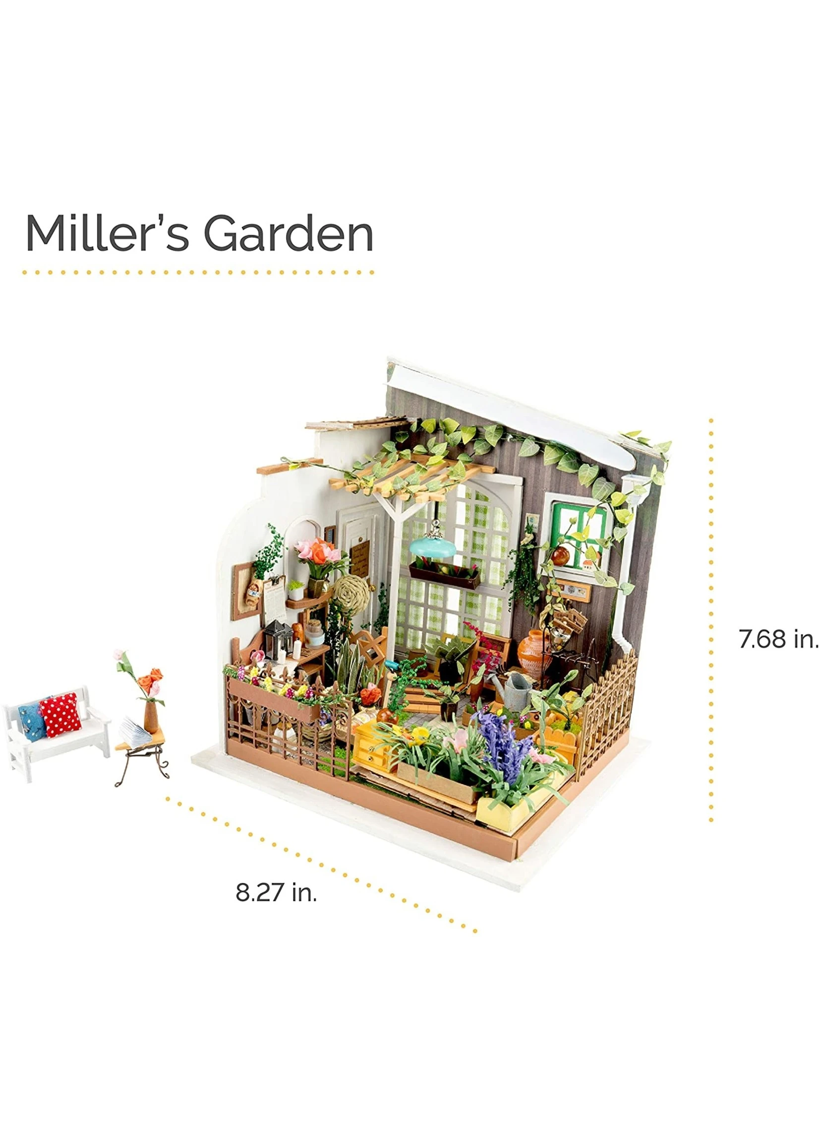 MILLER’S GARDEN: This small house was specifically made with your enjoyment in mind, not your dolls’. This kit has everything in it that you will need to start building a mini garden room with open walls. It is focused on flowers and plants. It could even be made into a green house for added detail.
