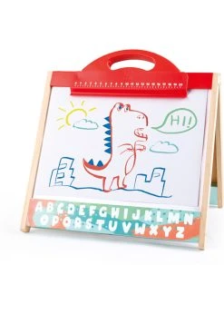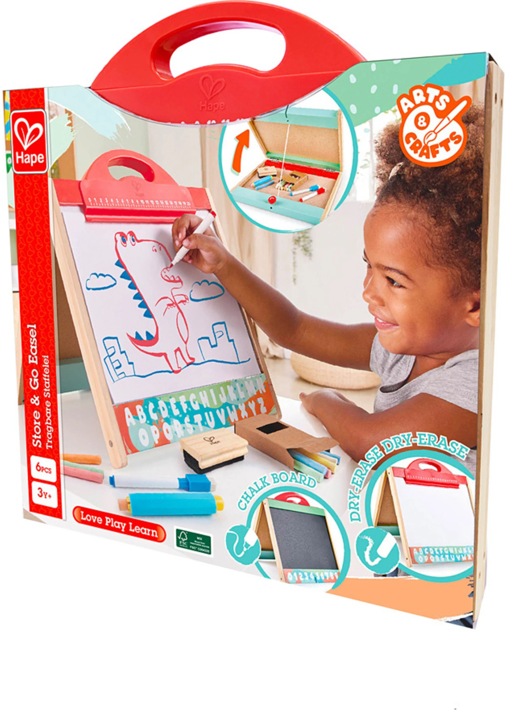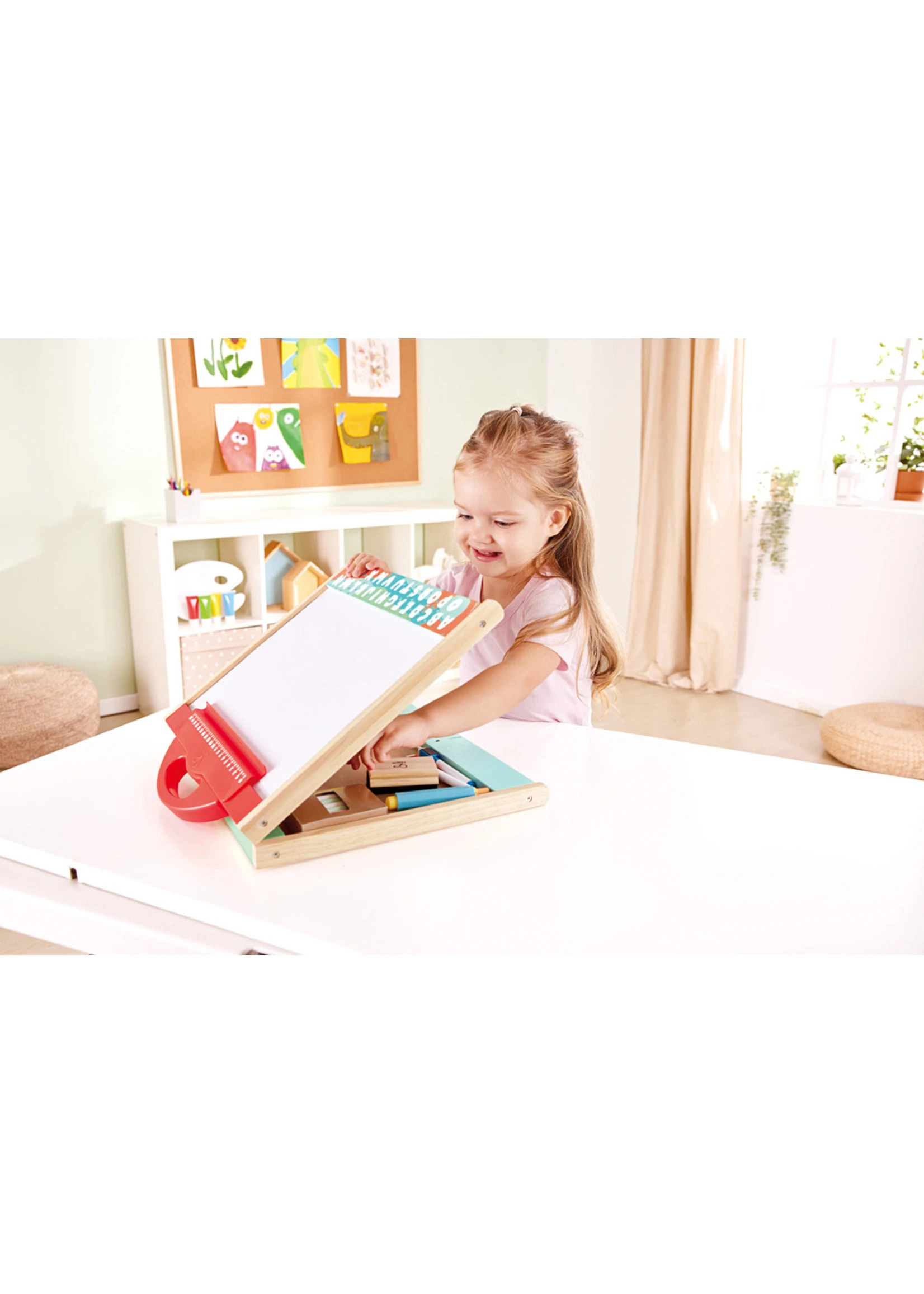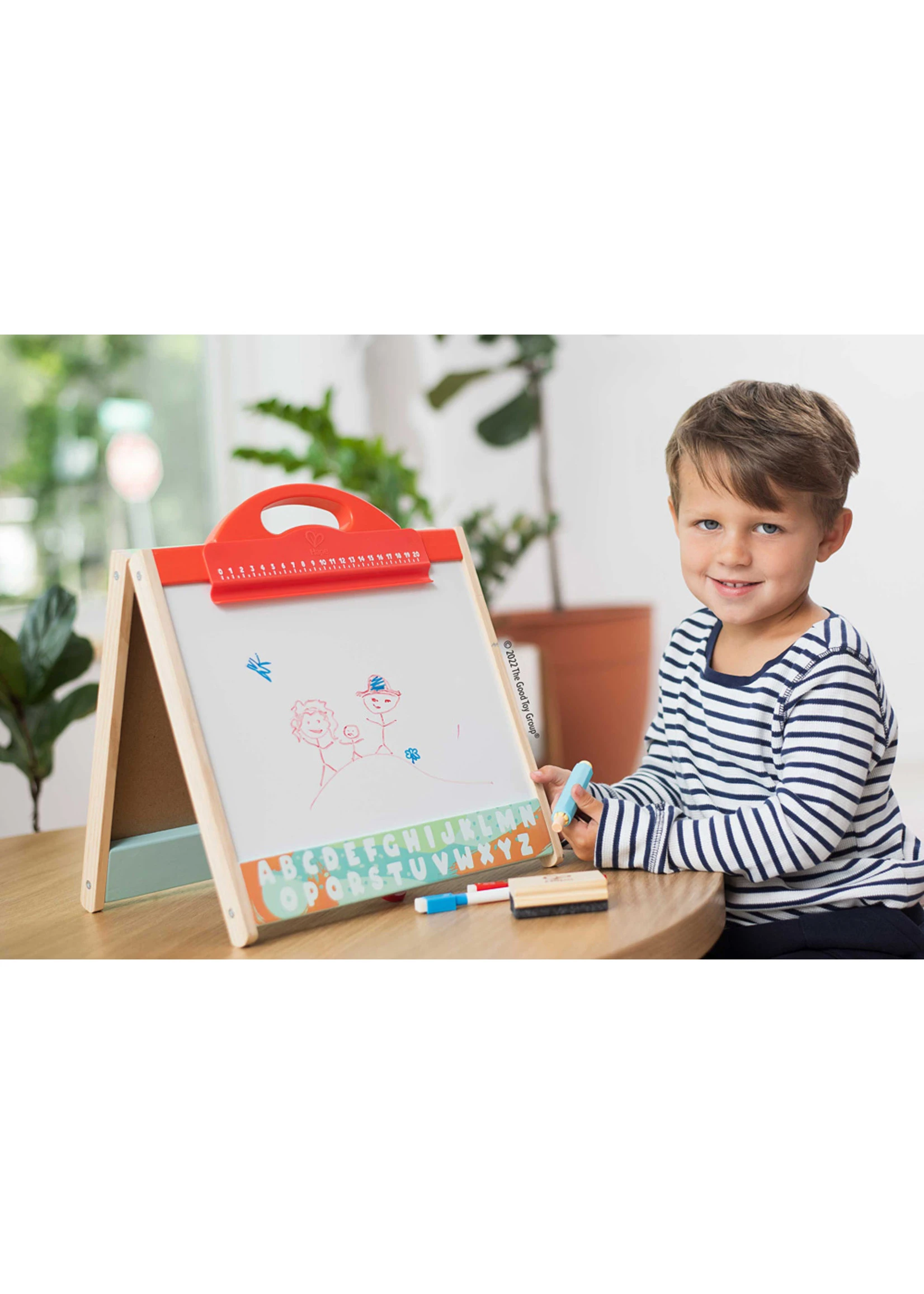 Help your child develop their creativity with the 3-in-1 tabletop easel. Functioning as a chalk blackboard, a magnetic whiteboard, and a sturdy carrying case, it is perfect for an on-the-go aspiring artist. The tabletop artboard features a chalk blackboard for scribbling and writing with chalk and a whiteboard for markers. A magnetic surface lets the whiteboard hold magnetic tools, numbers, and letters (sold separately), great for games and learning. When not in use, the art kit folds up into a durable carrying case that can hold all the supplies and accessories for the board, making for compact storage and easy transportation.