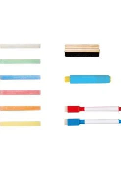 - Comes with 1 chalkboard eraser, 2 magnetic whiteboard markers with eraser tops, 12 colored chalks, and a chalk holder