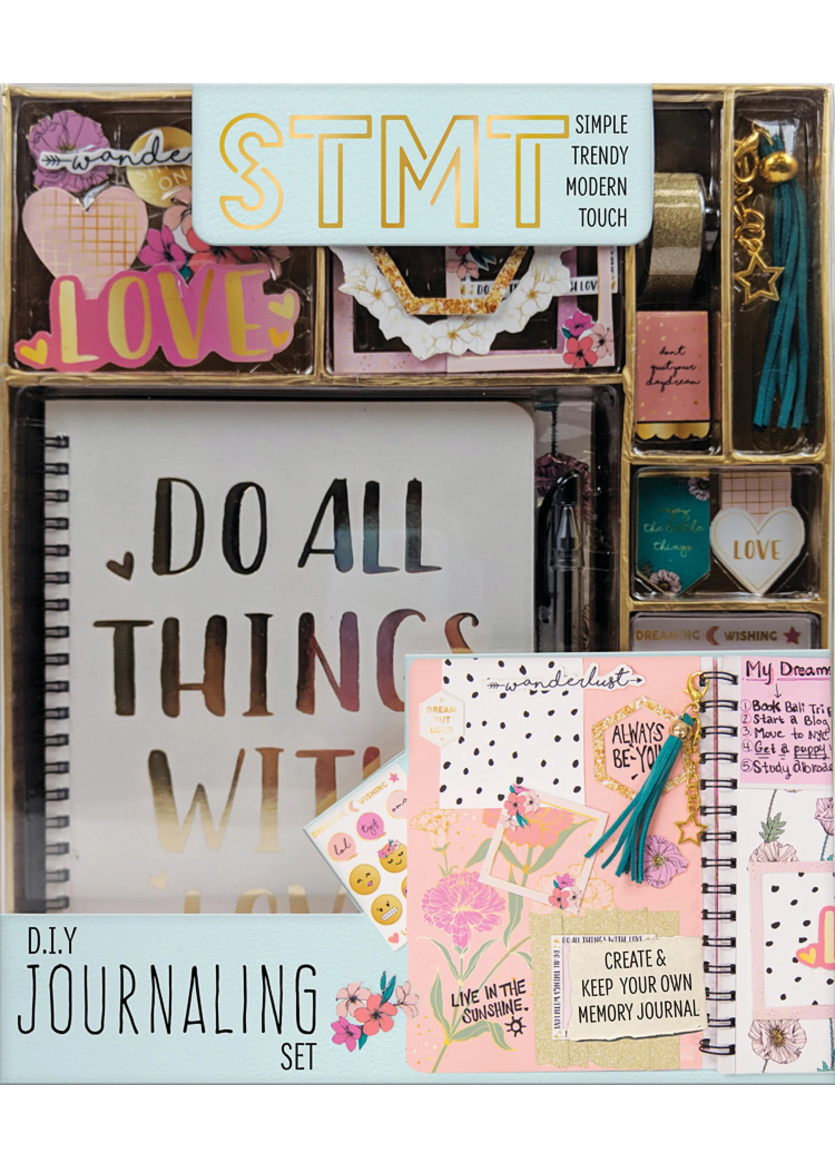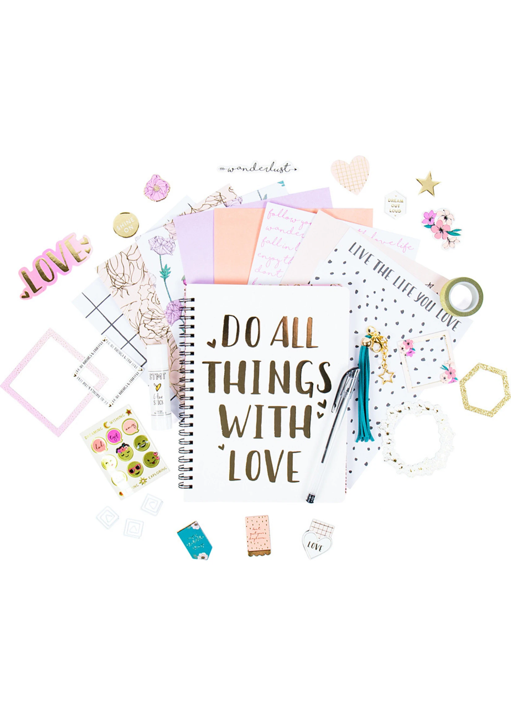 What’s the story? Dreams, secrets, intentions, and goals recorded in the very special spiral-bound journal created by you. There are stickers, bookmarks, glitter tape, 5 chipboard frames–the many thoughtful accessories make it “a keeper.”