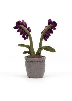 Amuseable Orchid is always in bloom, showing off ruffly plum velour flowers. Each fuzzy blossom has an orange ribbon flourish, perched on a fresh green needlecord stem. With cordy leaves and cocoa boots, fluffy fudge soil and a grey linen pot, this orchid has hothouse chic!