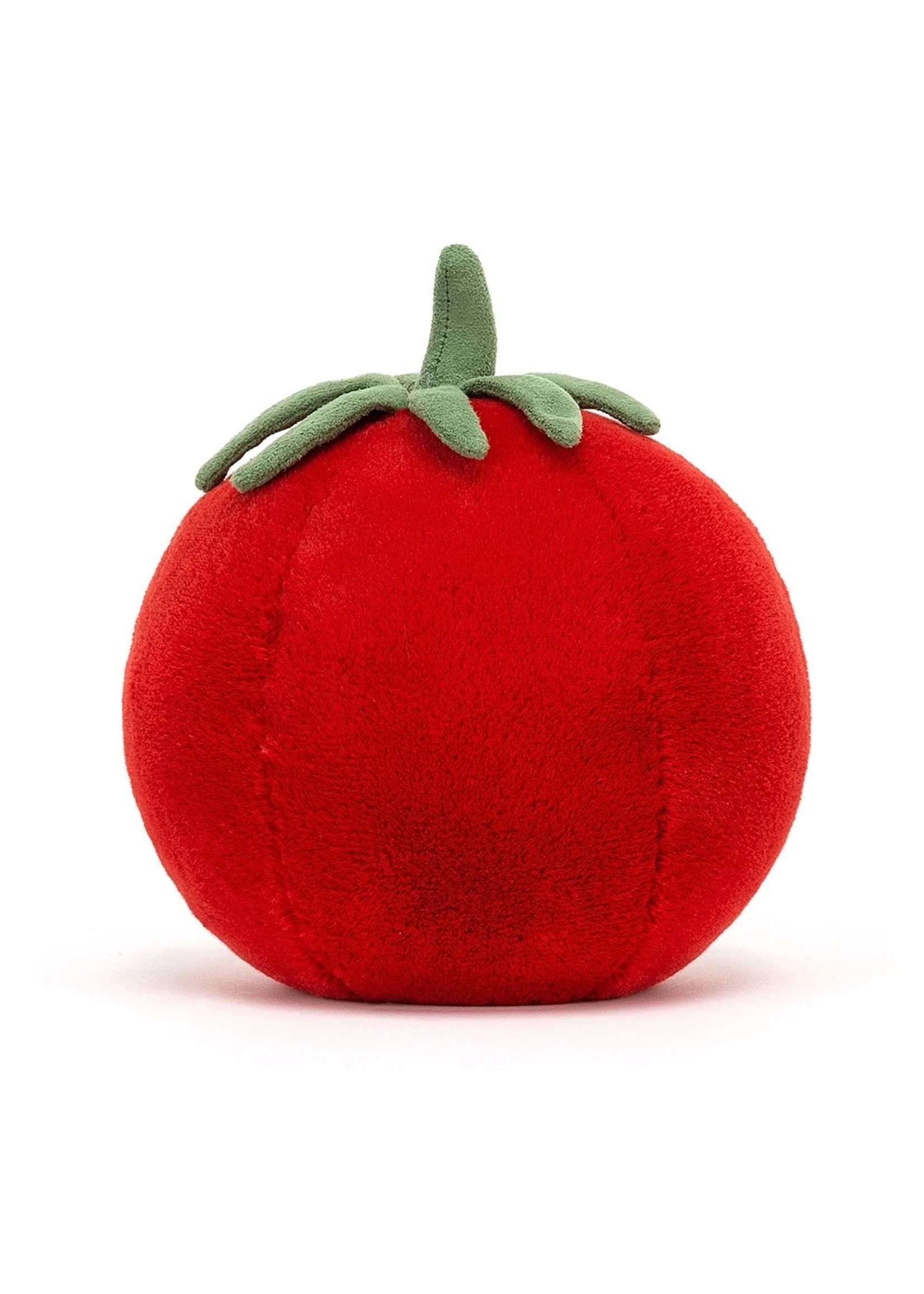 Amuseable Tomato is one sun-ripened rogue! Rosy and plump as a cricket ball, topped with a scruffly, leafy cap, this bright red bounder in toffee cord booties is equally at home in the kitchen or the garden. Anywhere where there’s sunlight, in fact!