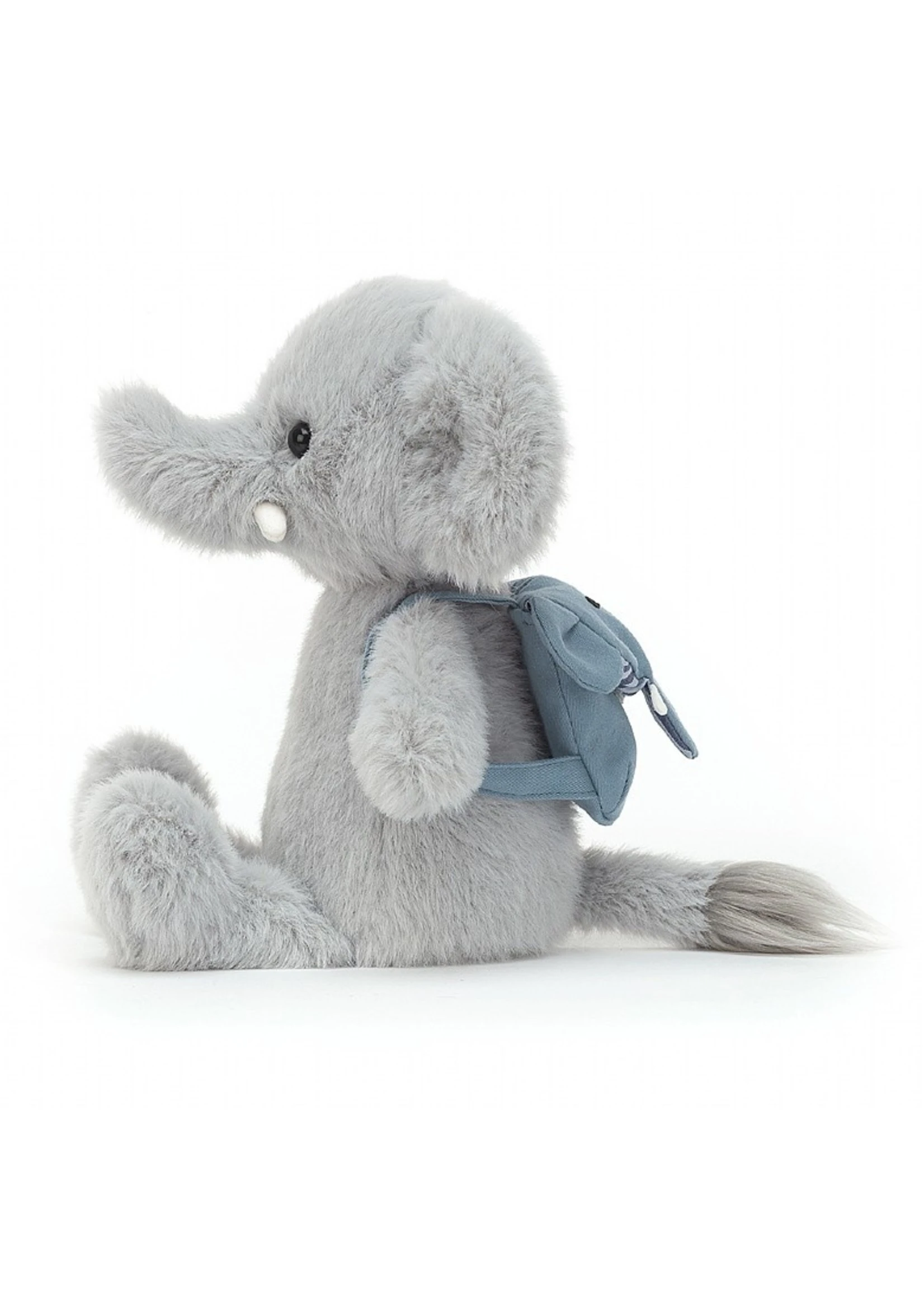 Backpack Elephant’s ready for the hike! This tusky, fuzzy grey pack-yderm hasn’t forgotten a single item, but needs to get a move on! With tufty tail, blue linen backpack and trunk raised quizzically, you can stomp out in style with this softy by your side!