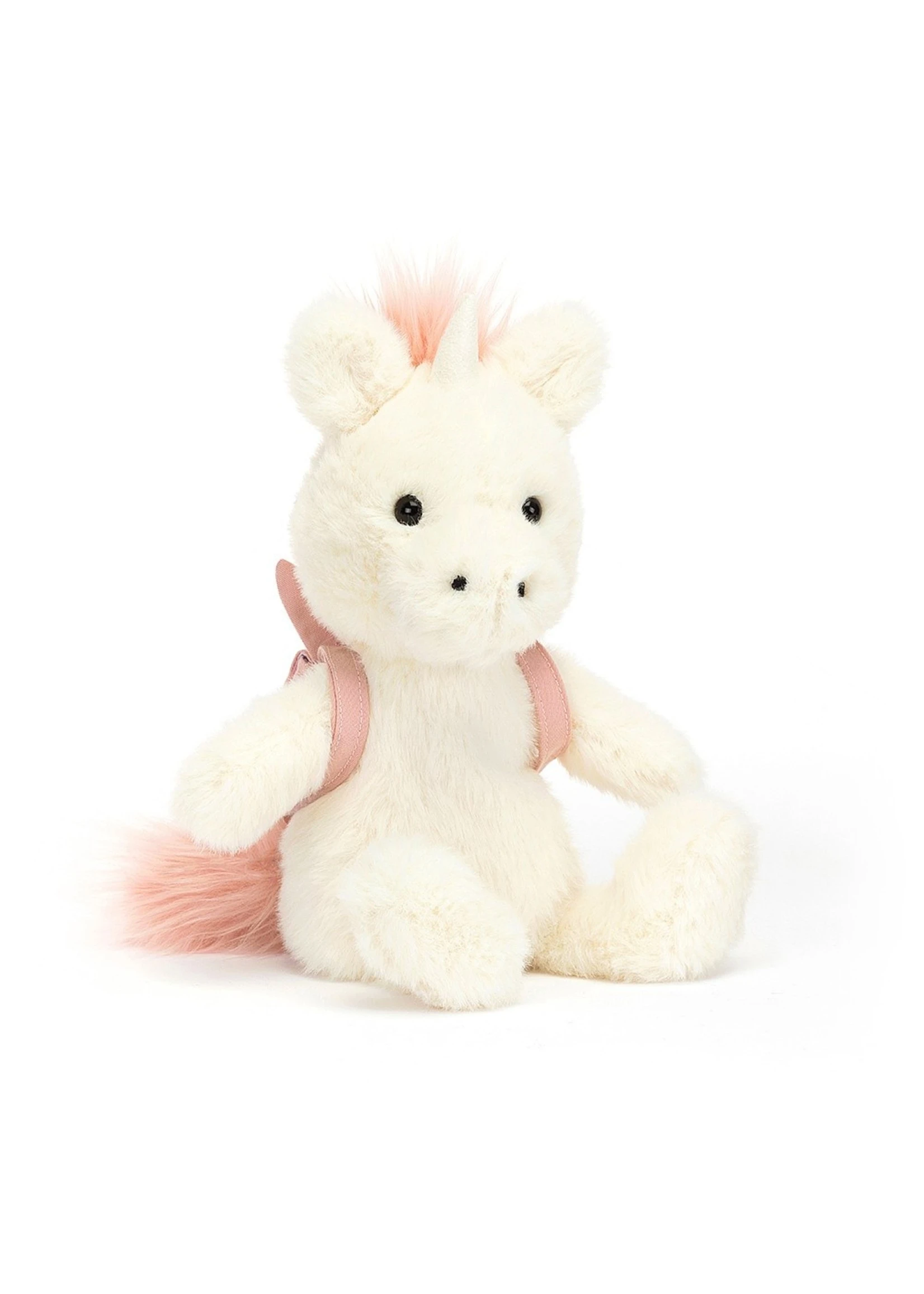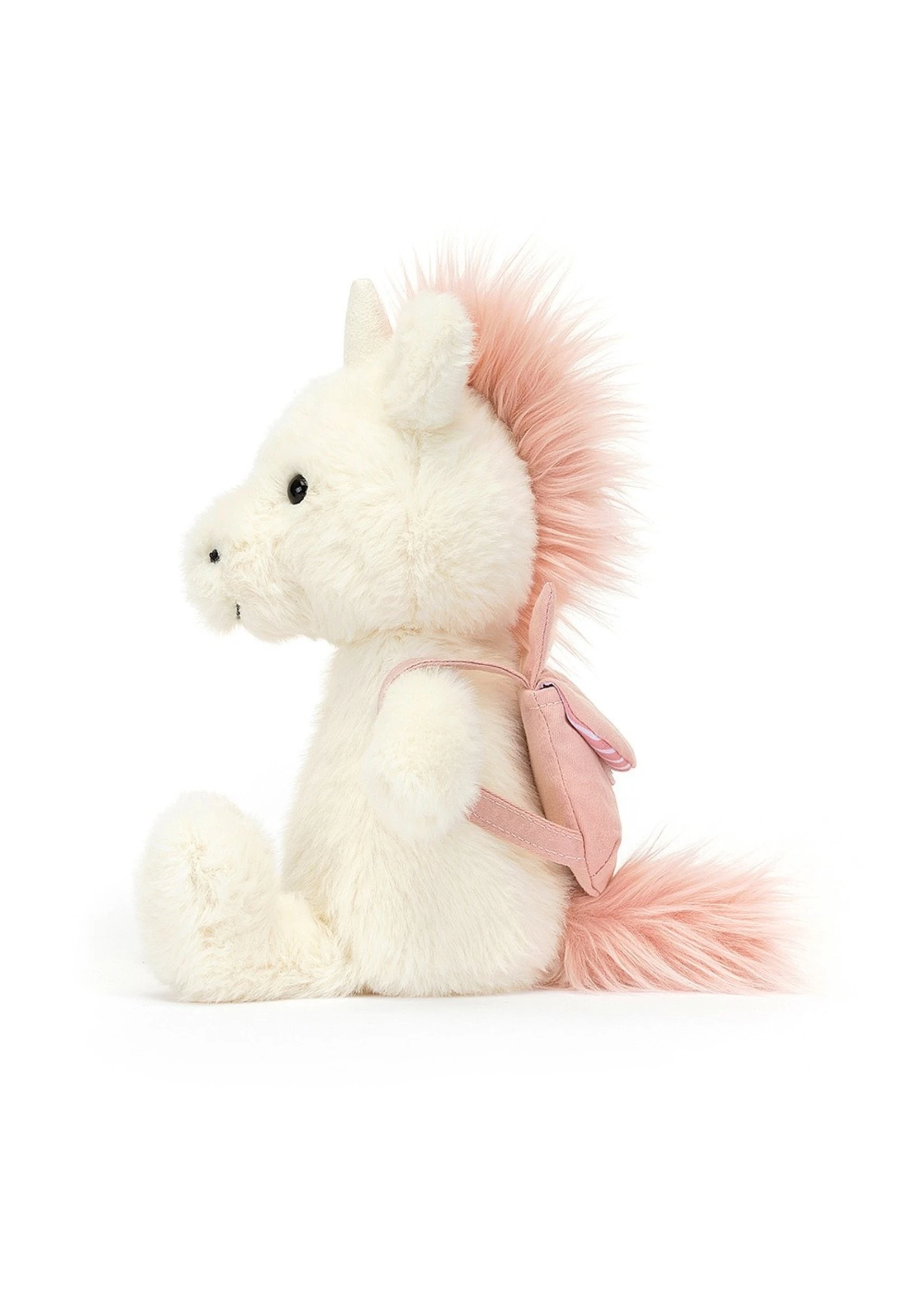 Backpack Unicorn is off on a quest! This brave little foal has tussle cream fur, a petal-pink mane and matching tail, and the sweetest suedey horn. Their unicorn backpack is fully lined and perfect for tiny supplies! With tufty ears, supersoft hooves and big bright eyes, this is one magical rambler!