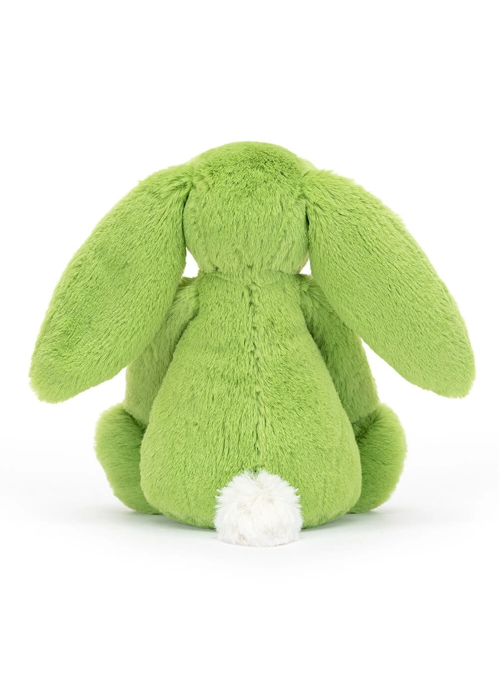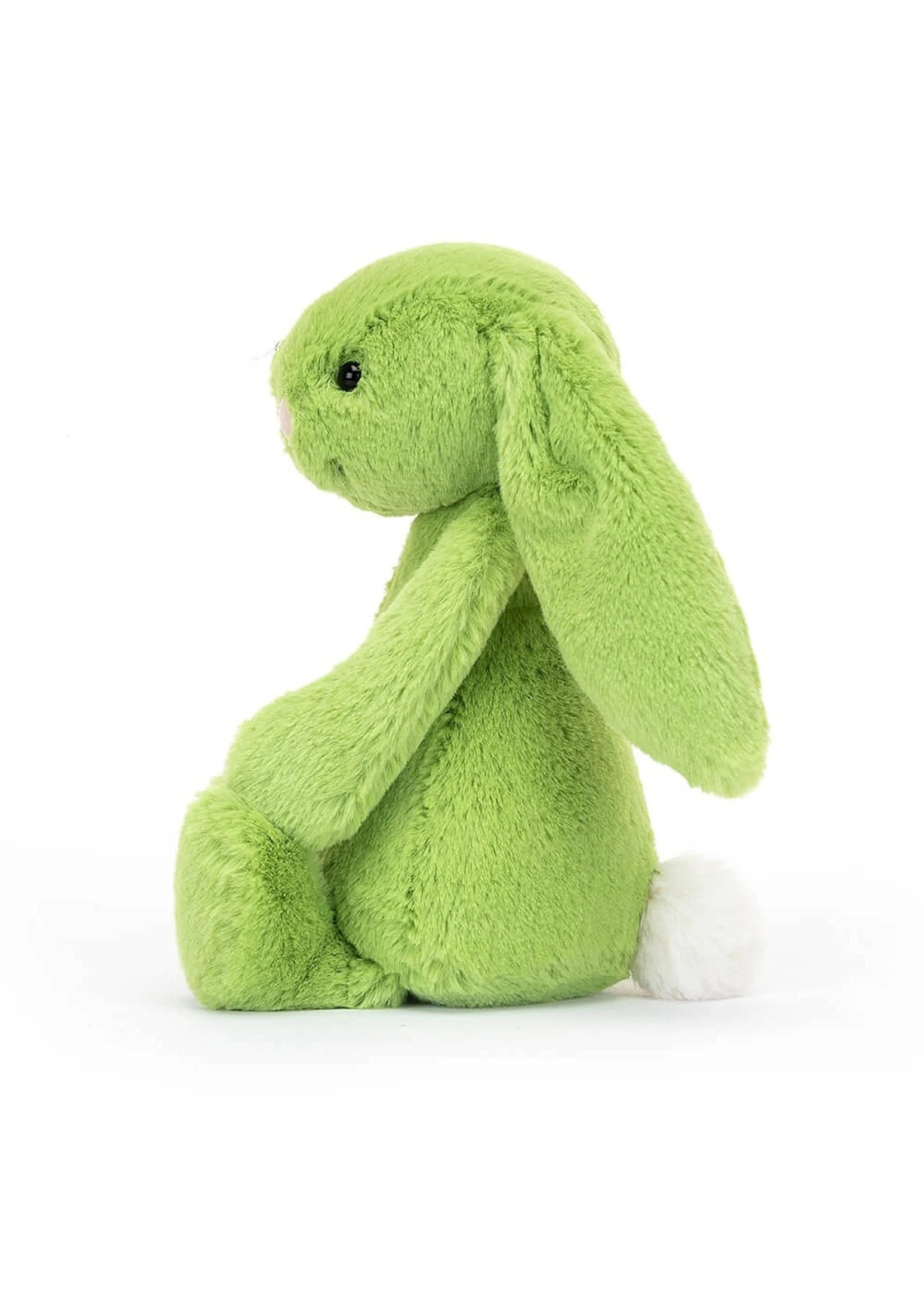 A Bashful Apple Bunny a day keeps the blues away! This funky, fruity friend has the zingiest fur, with chunky paws and waggly ears. A contrast white bobtail and suedey pink nose set off that gorgeous green. A cheery chum to help you remember to munch some nice fresh fruit!Â