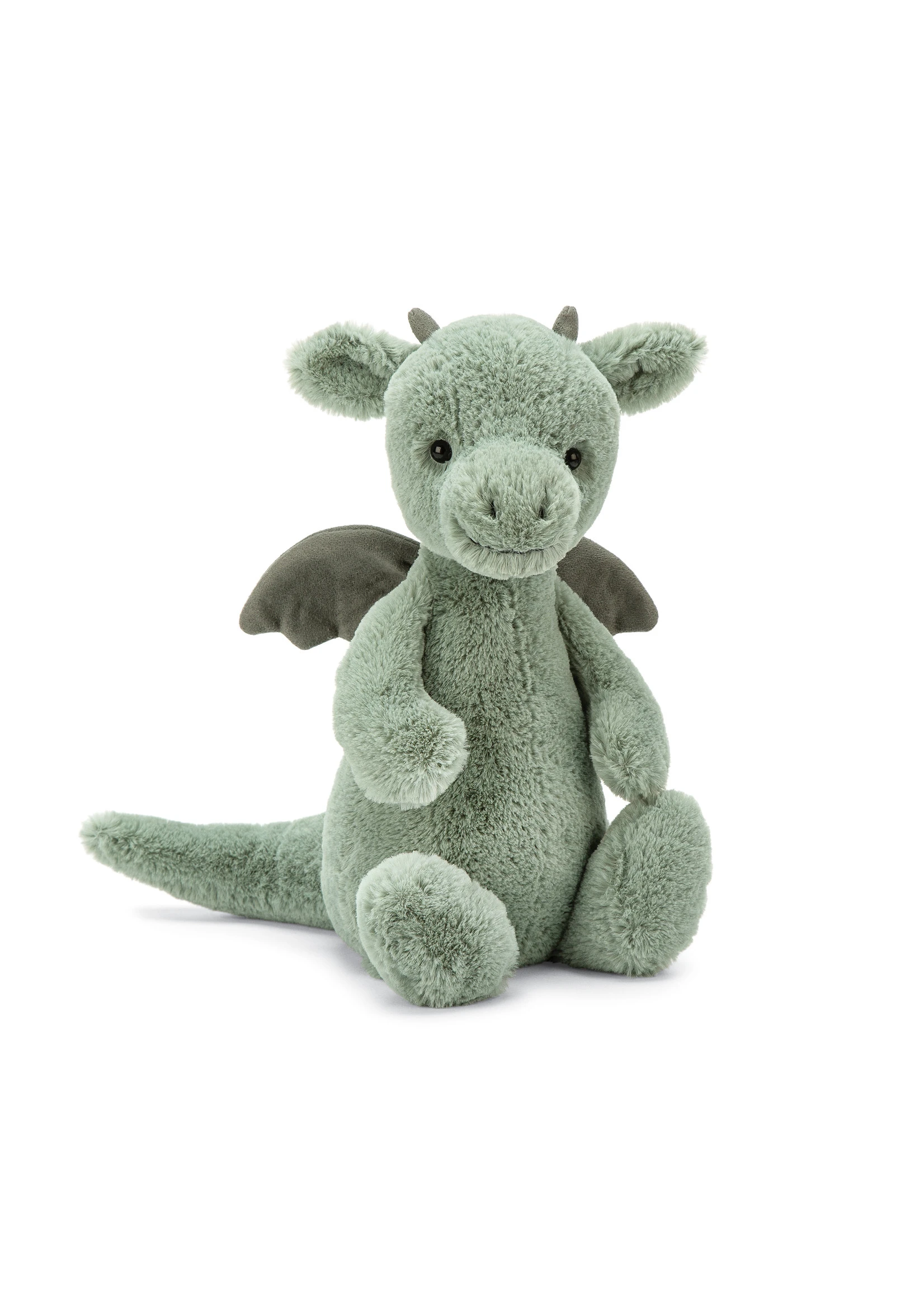 Bashful Dragon is a fierce little friend, with plenty of attitude! With supersoft fur in pale sage green, suedey horns and a long, squidgy tail, this brilliant beastie is pretty fantastic. We love those neat little contrast wings, chunky feet and fine flappy ears – what a legend!