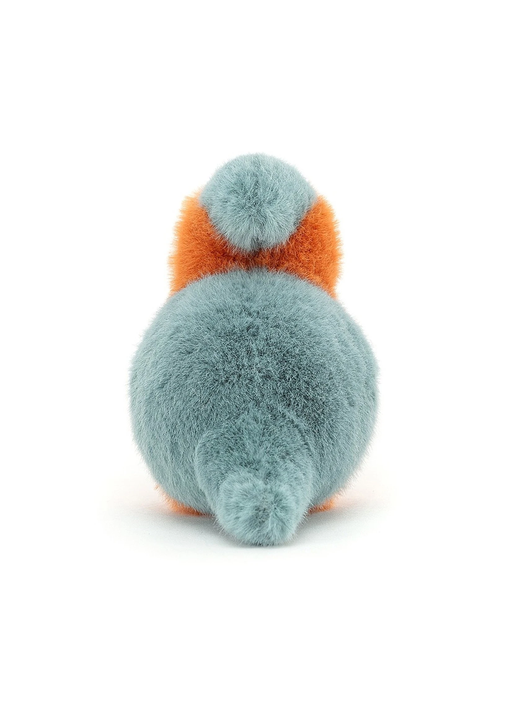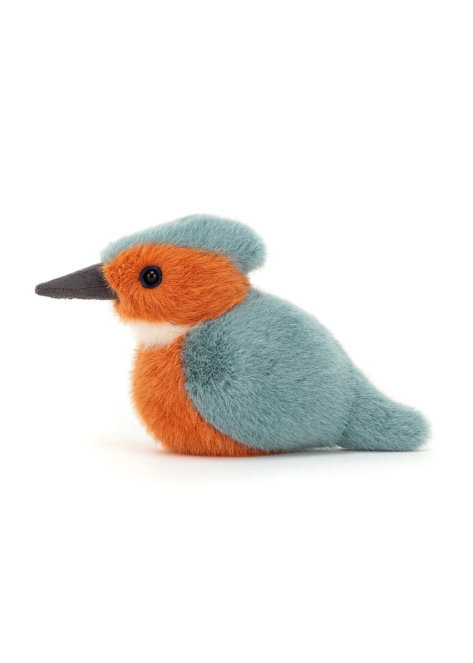 Birdling Kingfisher loves perching patiently, waiting to spy some dinner in the river! This striking scamp has soft, bright fur in pastel blue, rust-red and cloudy white, with a keen bright eye and a cool grey beak for scooping up fish!