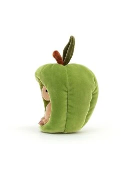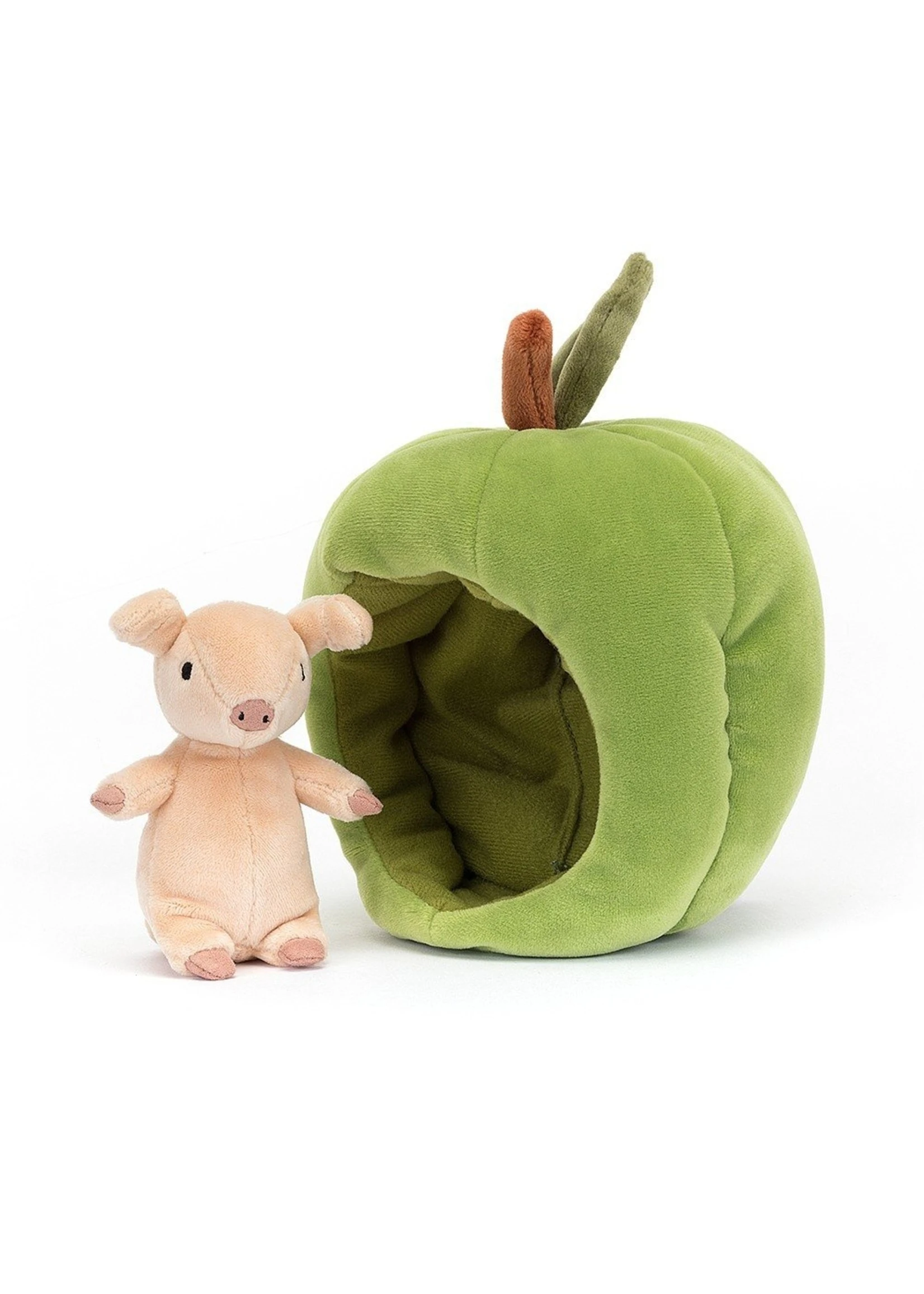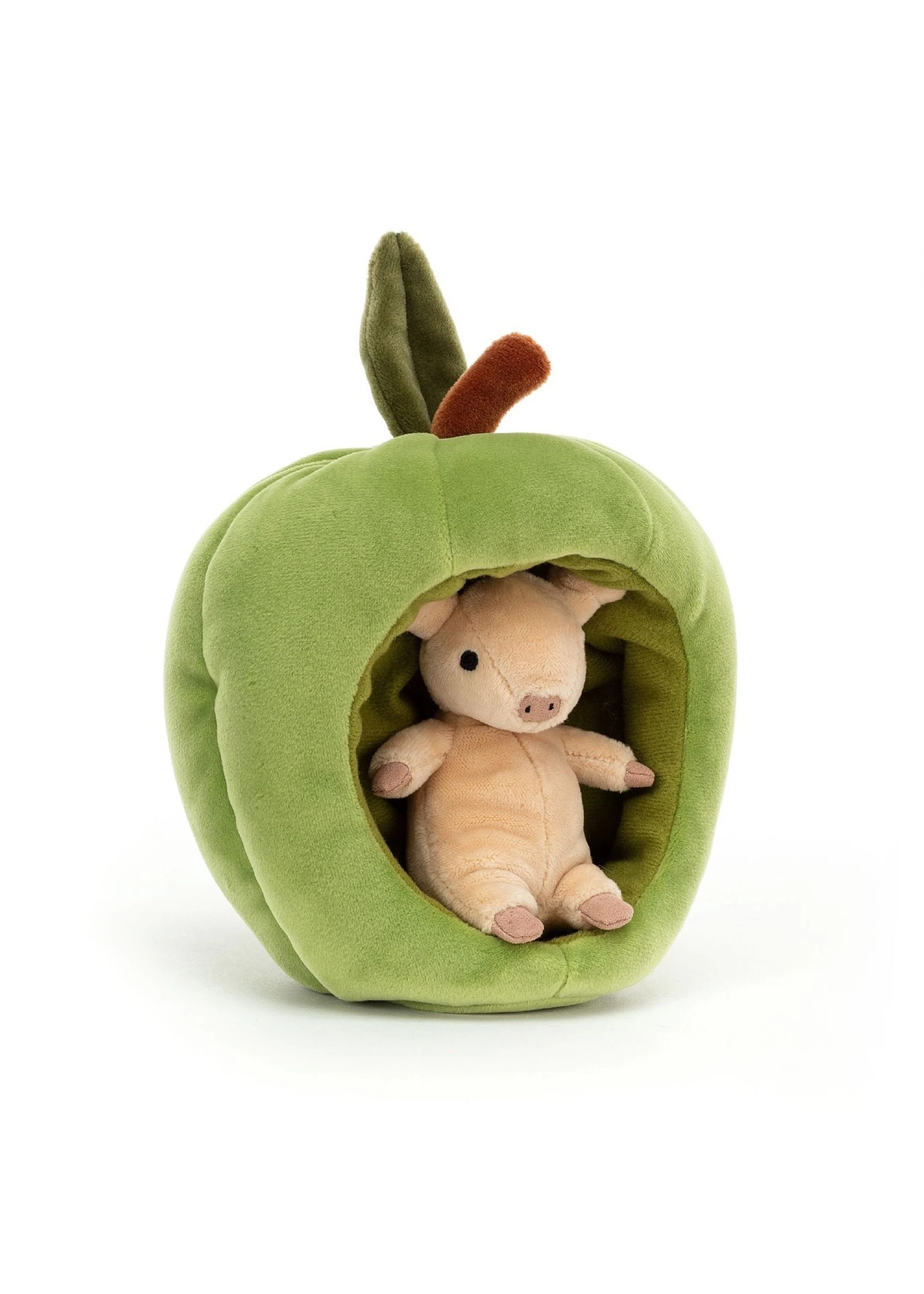 Brambling Pig has munched their way into a rather cosy hidey-hole! This peachy piglet is such a pipsqueak they can shelter from the rain in a green cooking apple! Stretchy-soft and cosily lined, with a velvety leaf on top, it’s Home Squeak Home!