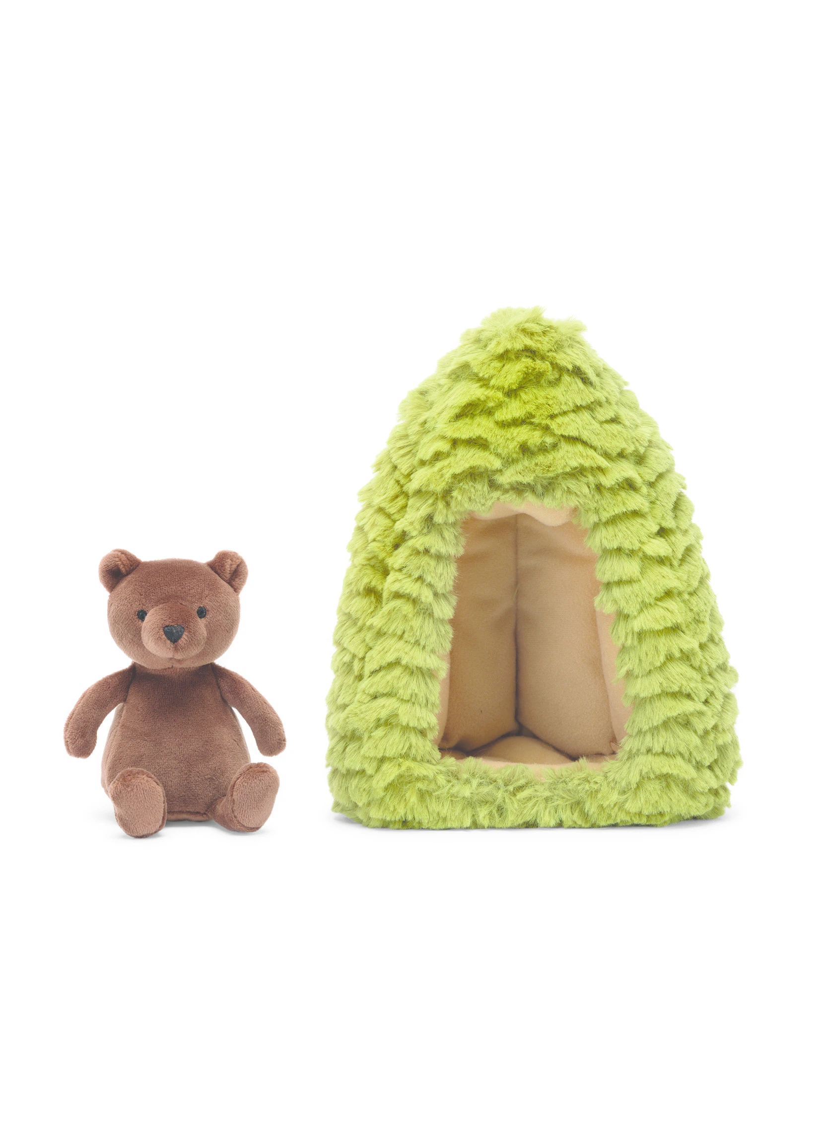 Welcome, welcome! Forest Fauna Bear is having a housewarming, though this quilted hideaway is cosy already! Our proud little pal has stretchy praline fur and lives in a gorgeous green tufty-soft tree! Popping in and out of the butterscotch lining, this wanderer’s settled down nicely!