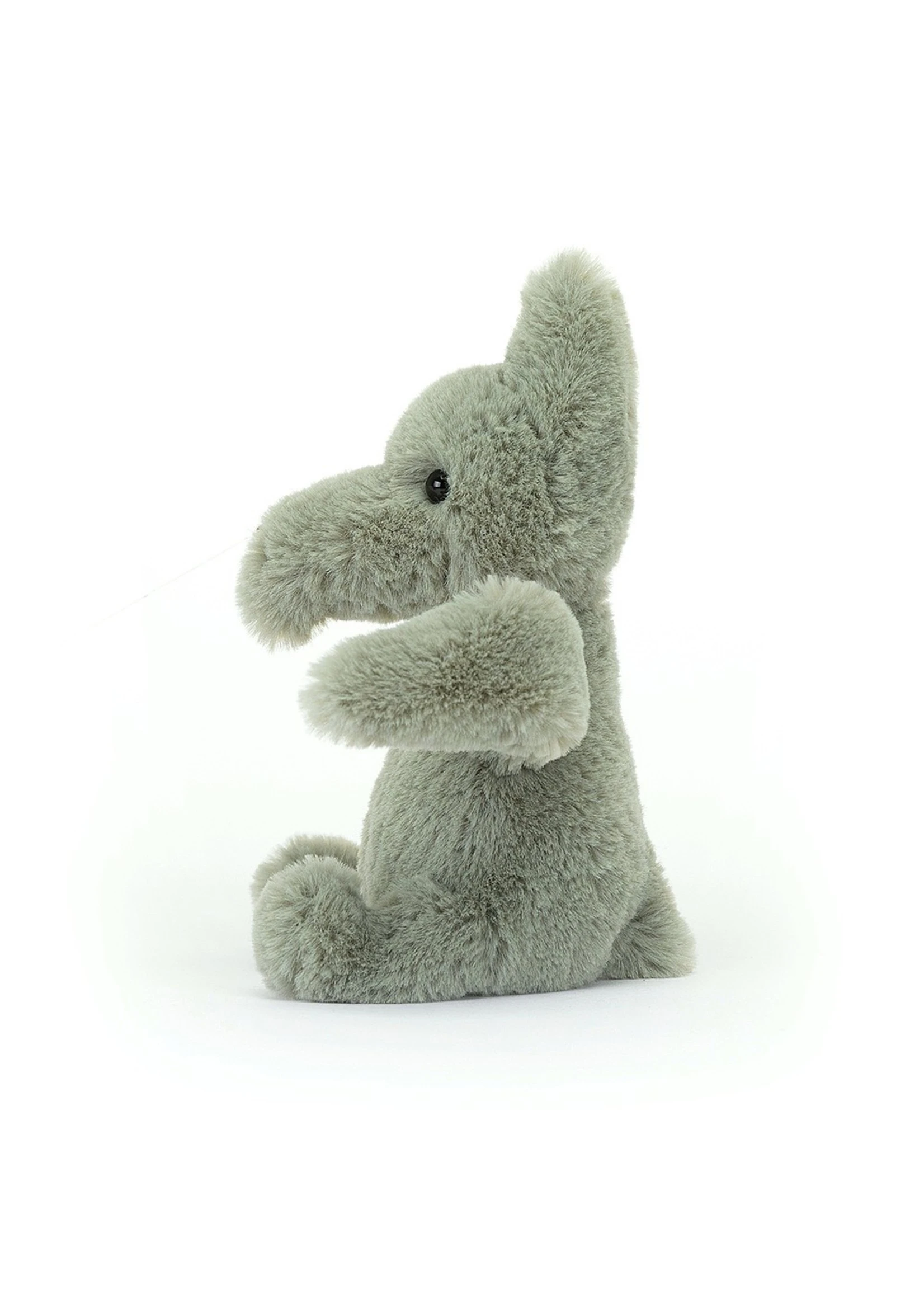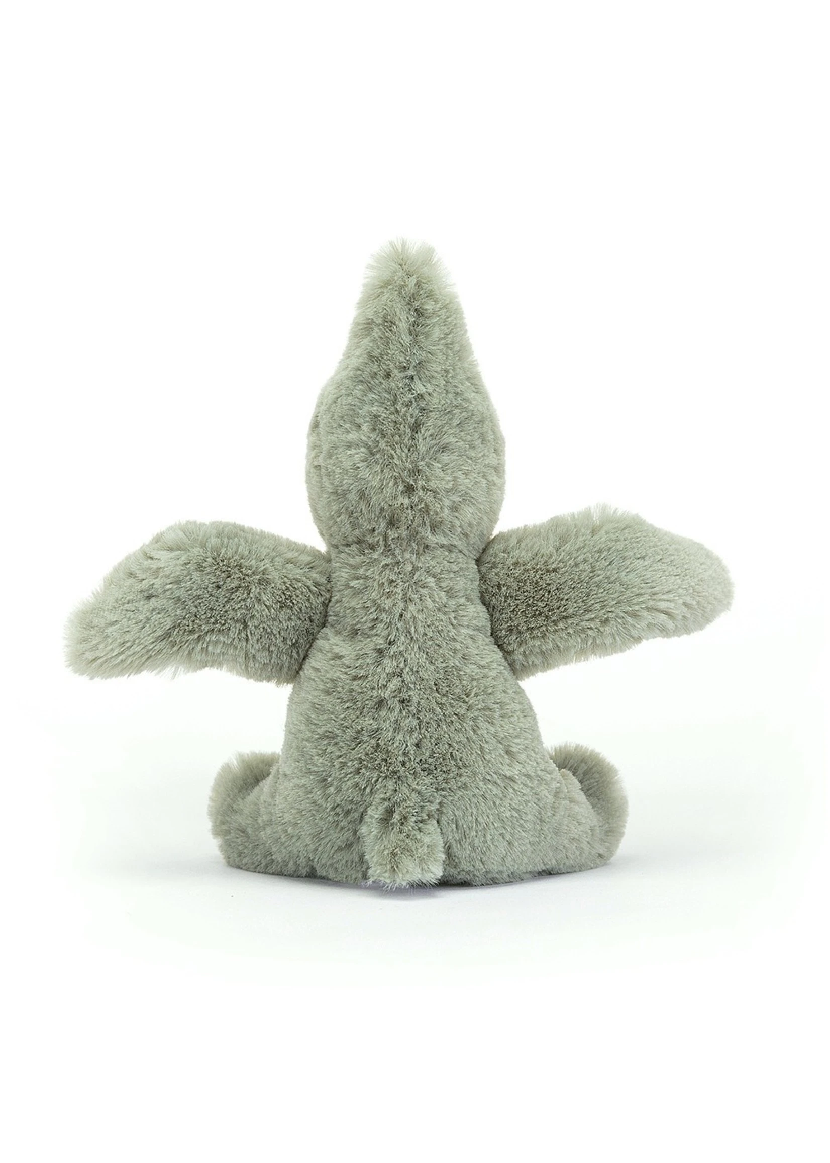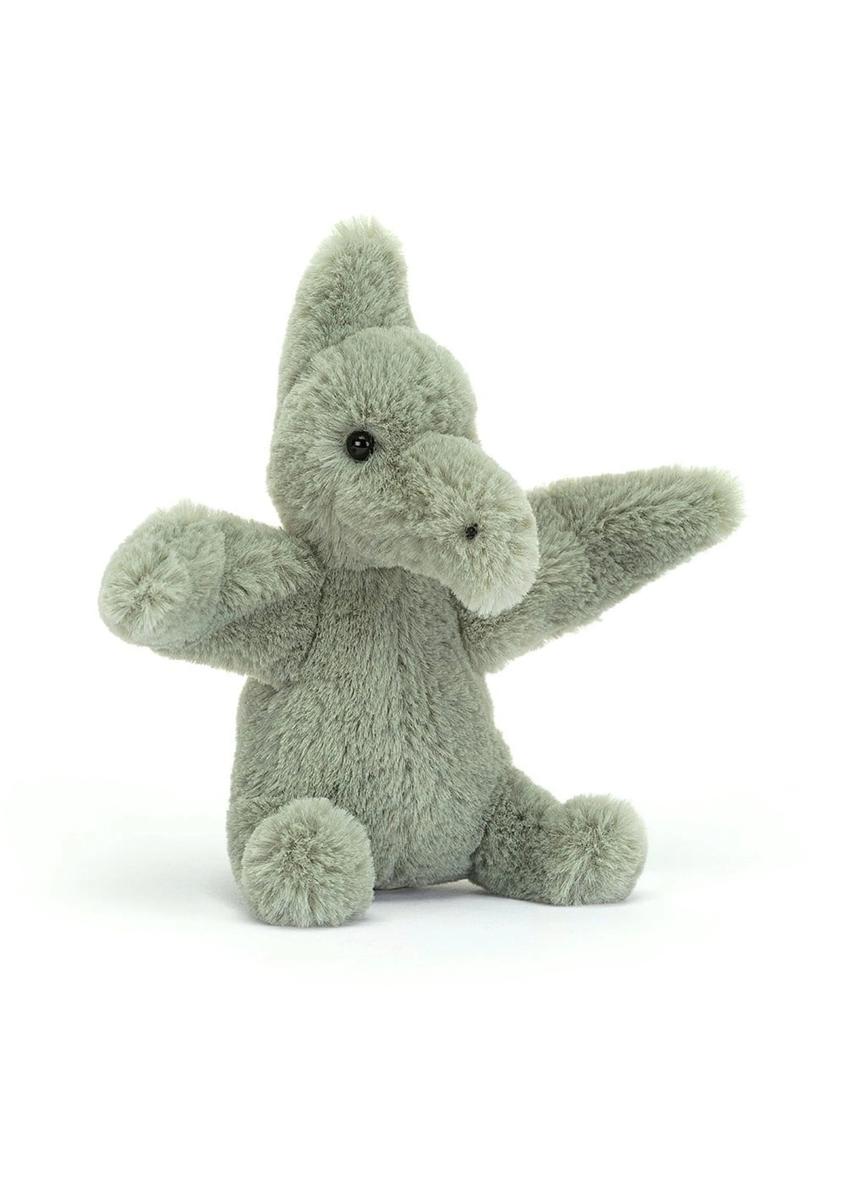 Fossily Pterodactyl is pleased as punch! After all, there’s nothing like swooping over the sea in search of a fishy supper. A prehistoric air ace in ivy green, with a funky crest and tiny tail, this softy of the skies will be right at home sharing a nest with you!