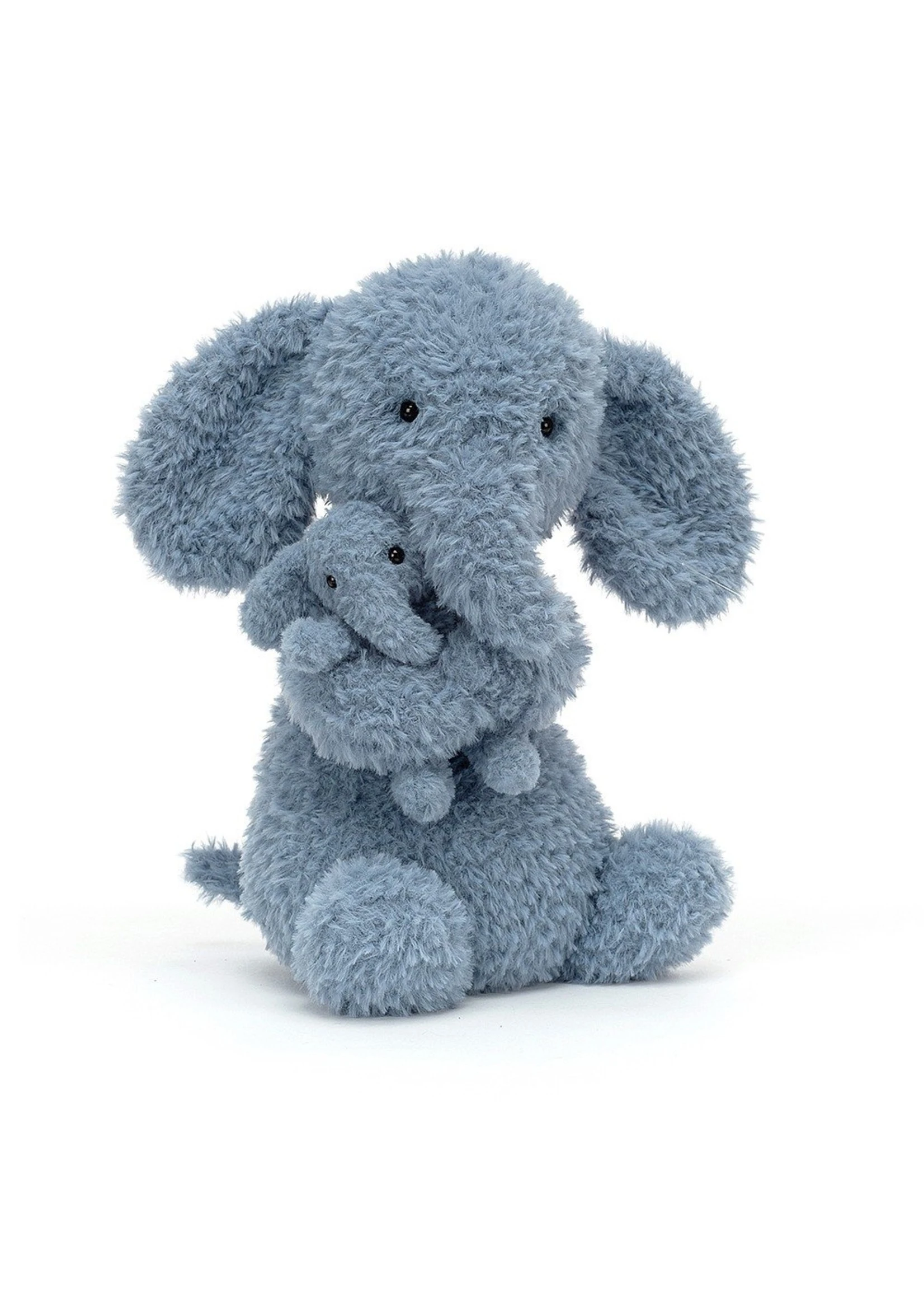 Huddles Elephant baby is all worn out after a long day. Luckily, mum or dad is here to offer a lift back home! In tumbly cornflower blue fur, with matching droopy ears and fuzzy trunks, these two are an elephantastic team, all cosied up together and on their way to a well-earned rest.