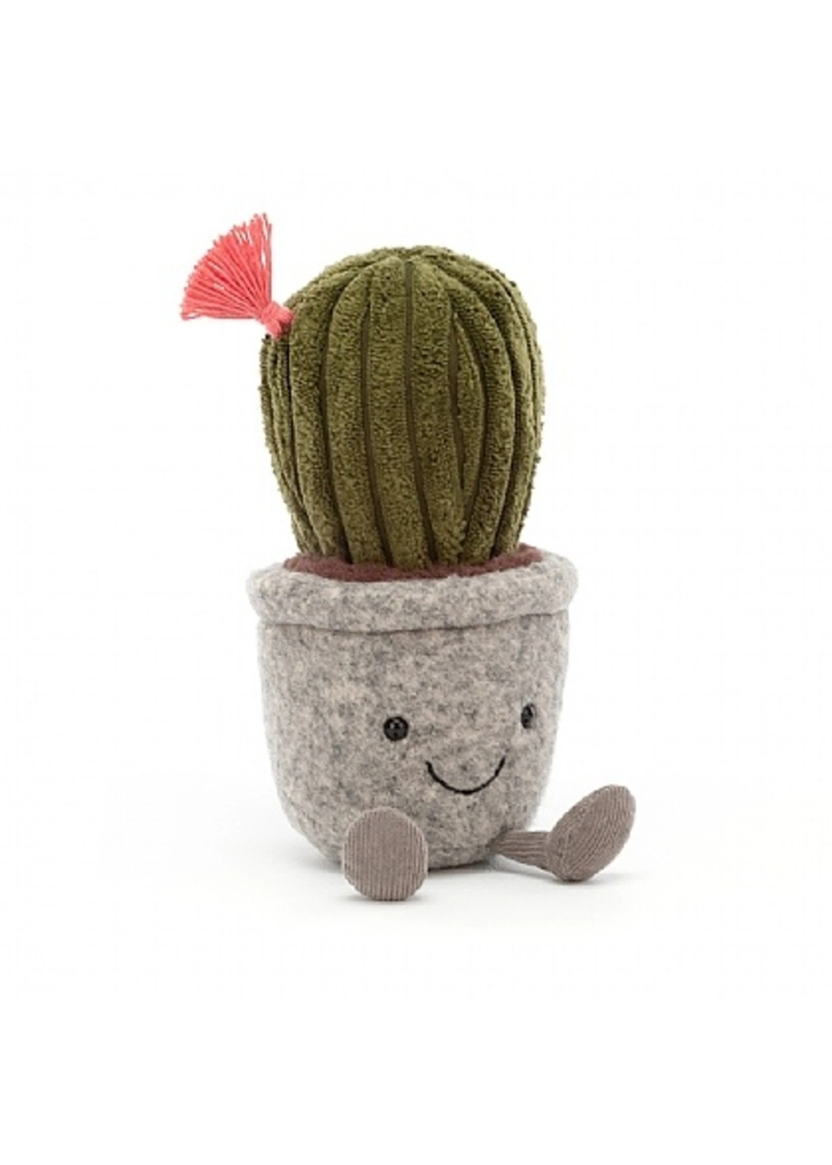 Silly Succulent Cactus is a dizzy desk plant with chunky green cordy fur and a snazzy coral tassel flower. With a mottled pot in soft grey felt, cocoa soil, little cordy legs and a great big smile, this cuddly cactus is the perfect workmate!