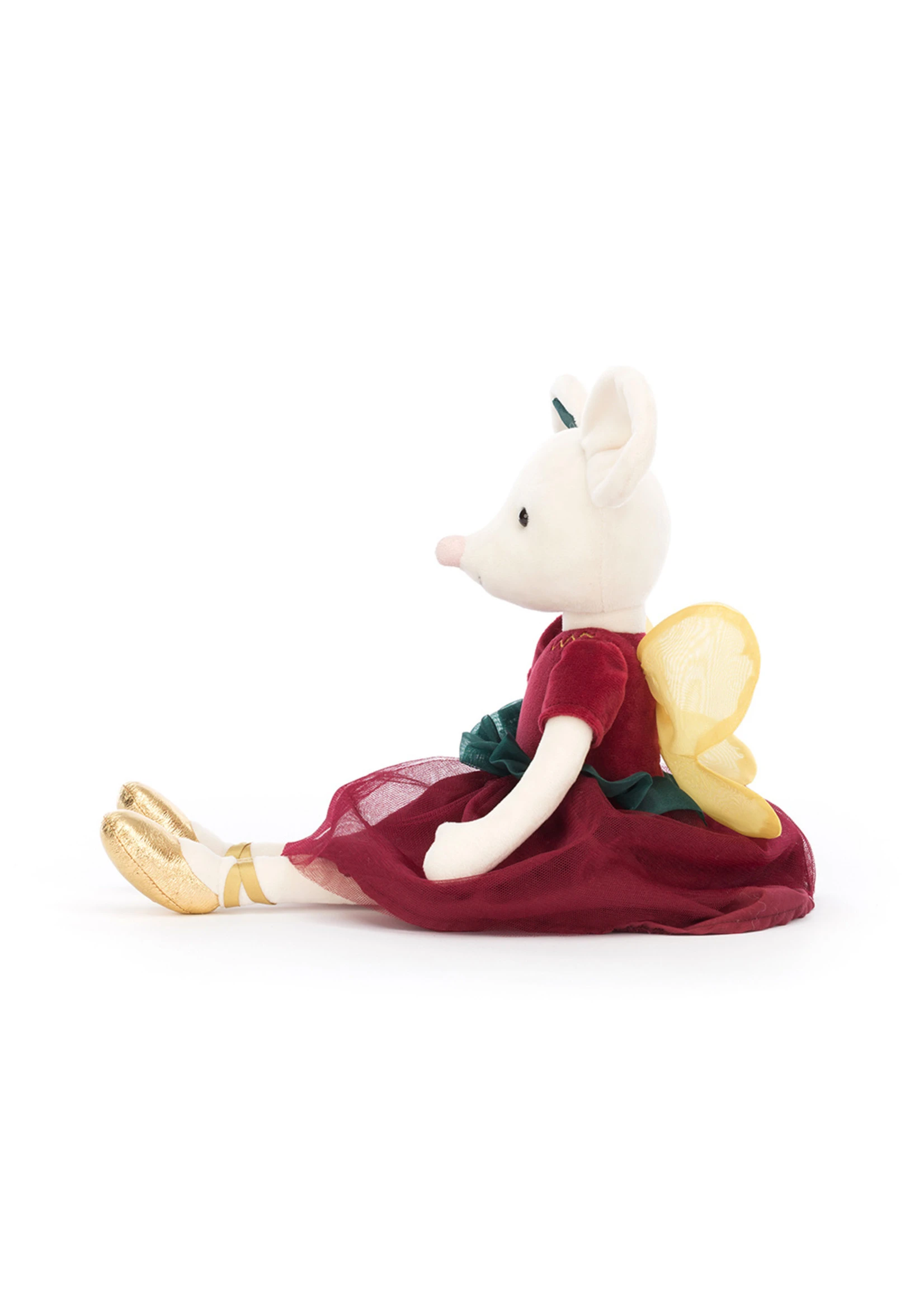 Making a fine festive debut, please welcome Sugar Plum Fairy Mouse! This dainty cream mouse wears a berry-red tutu, holly headpiece, green ruffle and shiny gold shoes! And to finish the costume, enchanted golden wings!Â
