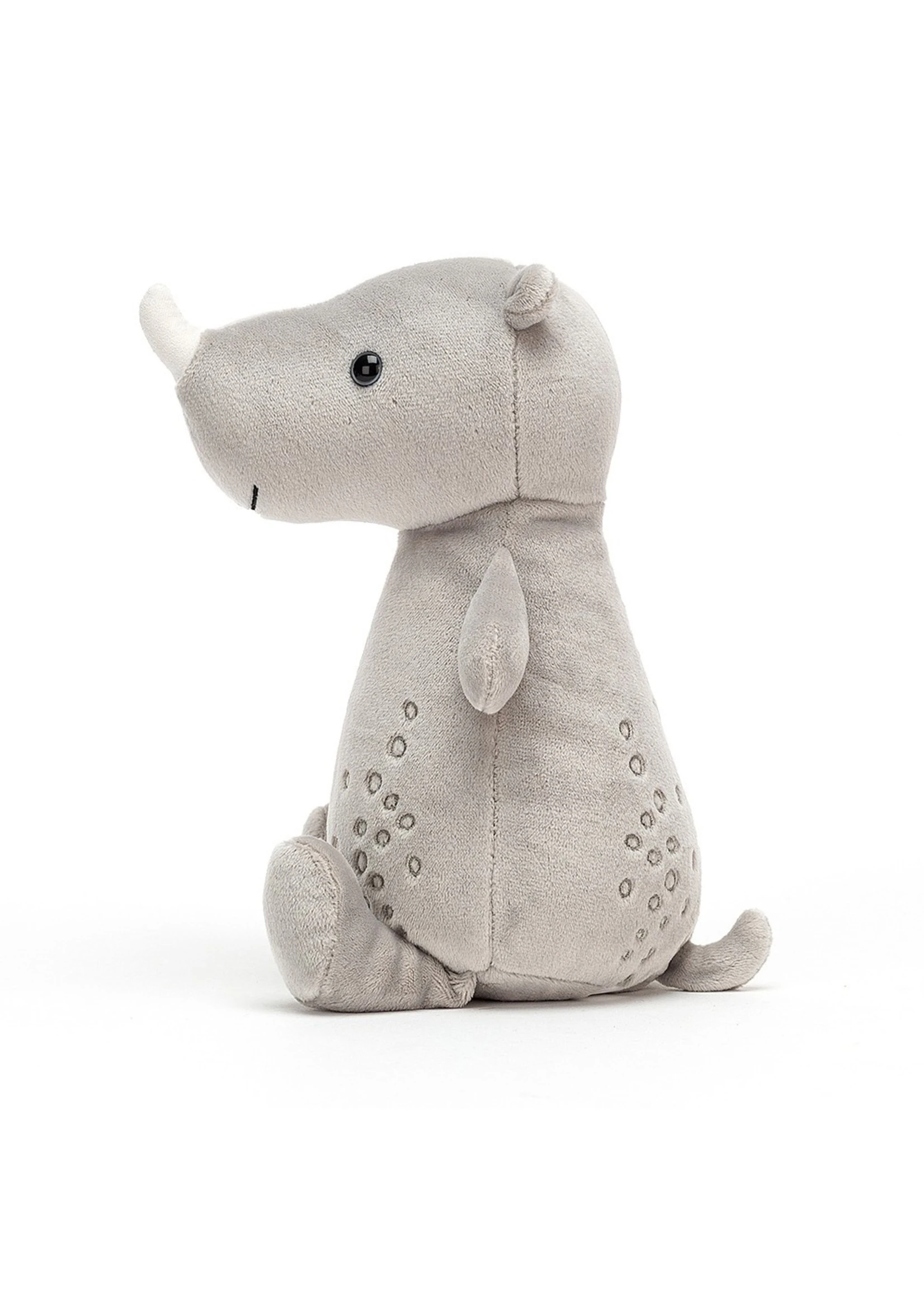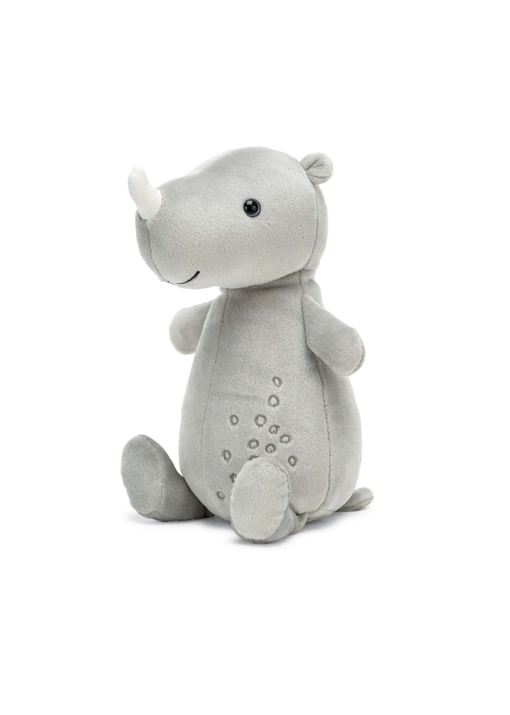 Woddletot Rhino is grey like a pebble, with textured stitch speckles and plenty of chuckles. Calming and comforting, this rumbly rhino has teeny-tiny ears, tail and paws, a soft nose-horn and a great big cosy tummy!