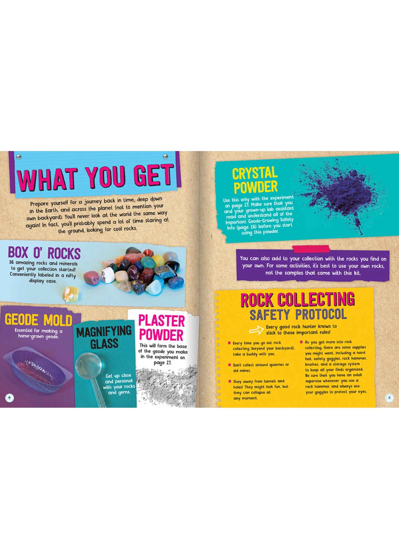 The colorful rocks you explore with this kit will opened the world of Earth science and geology! Kick-start your very own rock collection with the included stones. Then use the included crystal powder and mold to grow a geode formation. Collect rocks and conduct experiments, such as a scratch test and float test, to discover their hidden properties. You’ll even learn how to make your very own rock tumbler! Use the fact-filled book to keep exploring the world around you!