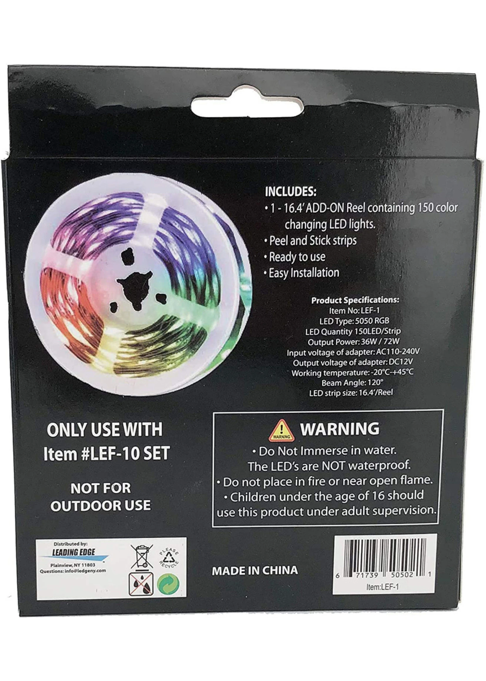 So versatile! Here’s an additional 16′ strip of 150 LED lights to add to your Smart LED Rainbow lights! Control them with your voice or Bluetooth, or program them using the Remote! Create ambiance for movie nights, set the mood for your morning routine, or sync them up to your favorite music. Adhesive and cuttable strips allow for easy installation on any clean, dry surface. Use the remote or your phone (app included) to program countless colors – and modes from solid, to strobe, to sound responsive. This is an ADD-ON light strip and will not work on it’s own. Use only with Leading Edge Novelty Light Set #LEF10.