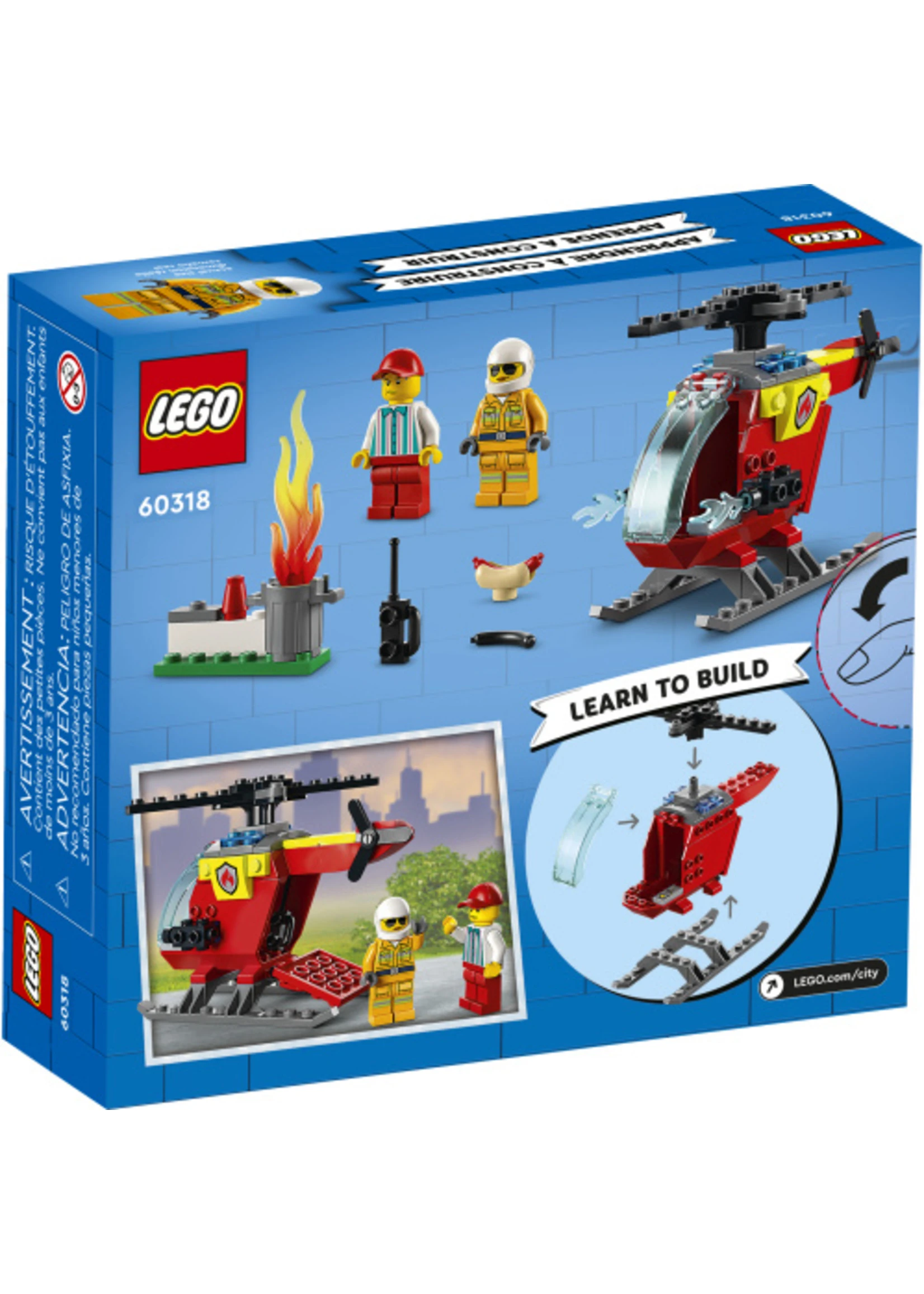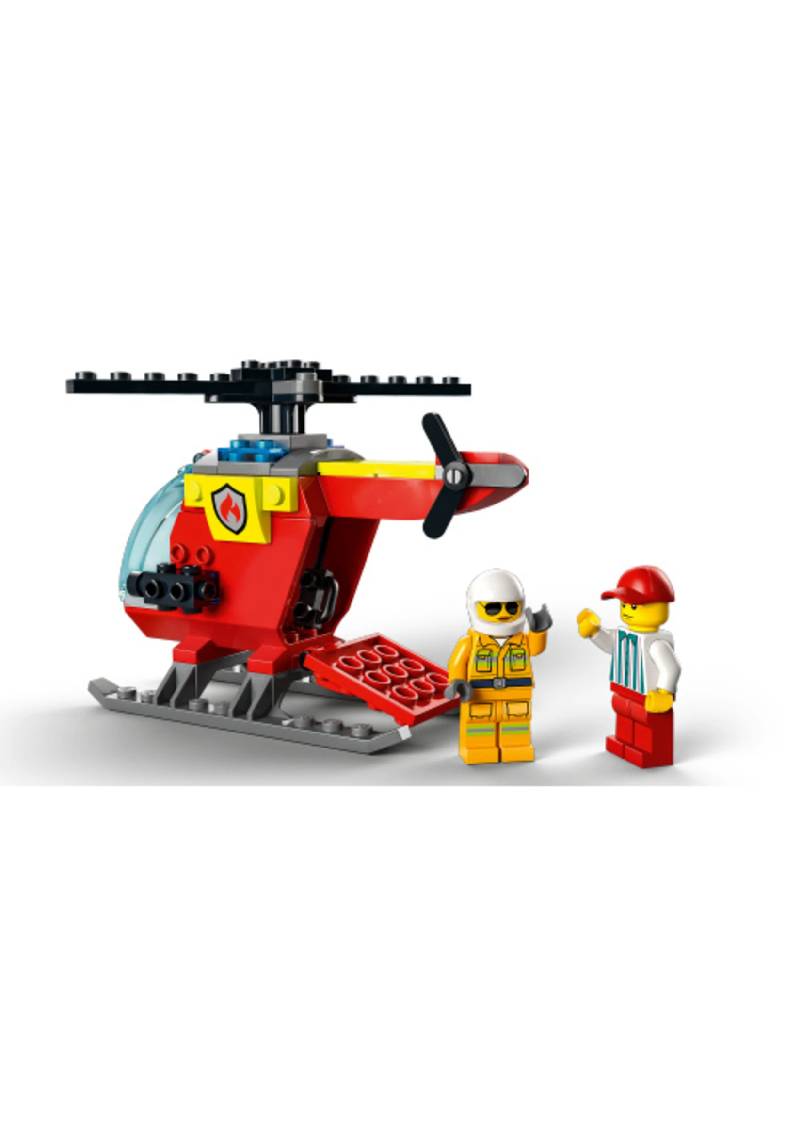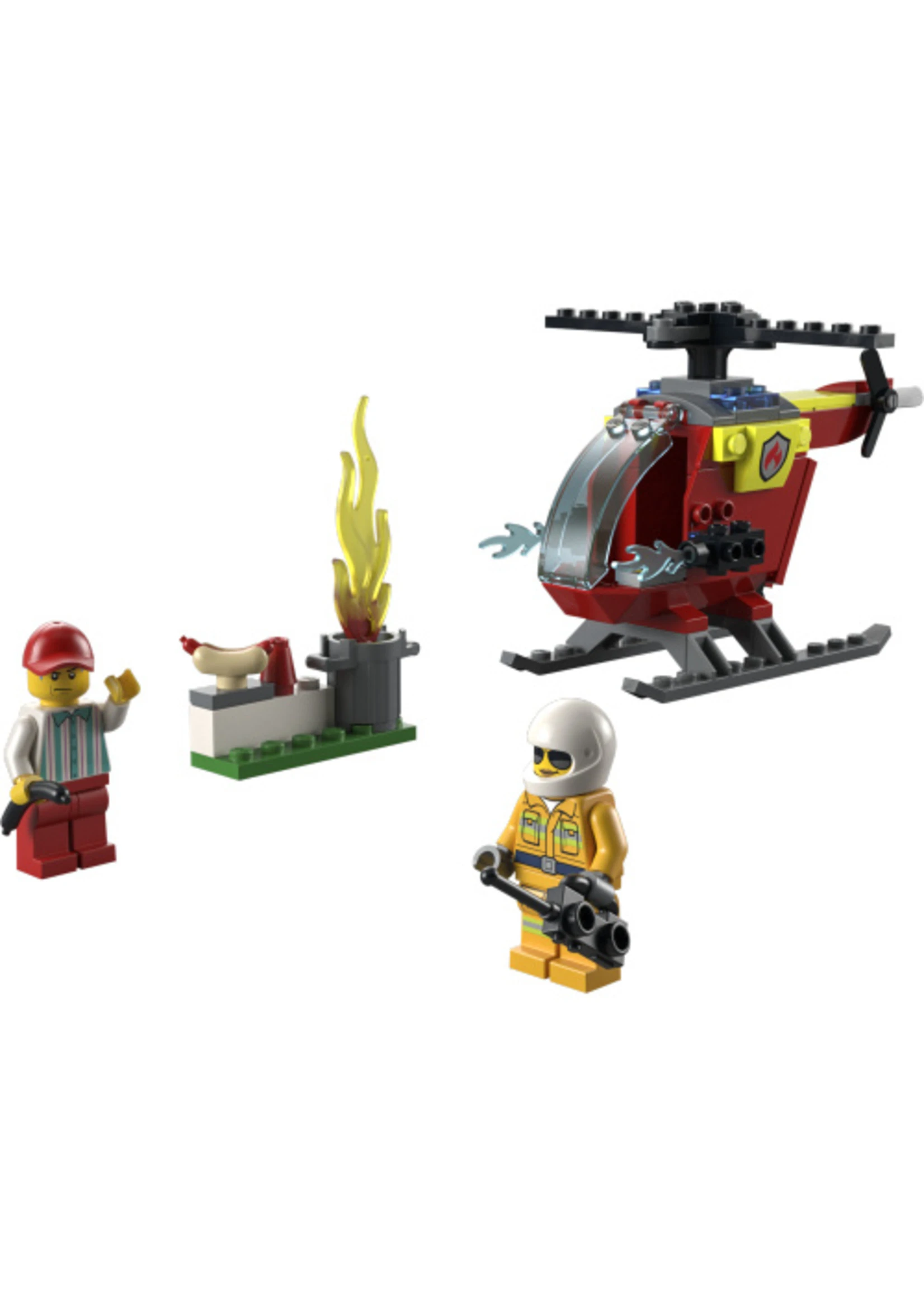 - What’s in the box? – Everything you need to build a toy fire helicopter, plus firefighter and vendor minifigures, a trash can with LEGO® flames and fun accessories, including a burnt hotdog