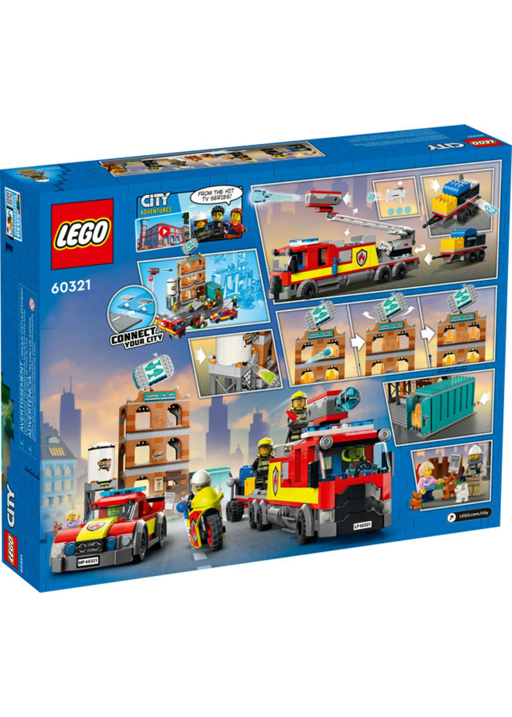 This LEGO® City Fire Brigade (60321) toy playset is packed with inspiration for imaginative play. Designed for ages 7 and up, it includes a 3-level sardine factory with fold-back LEGO flames and a ‘secret sauce’ vat, plus a firetruck and trailer that shoot water elements, a fire motorbike and a fire chief’s pickup. Add the kitten and cat figures and 7 minifigures, including 2 LEGO City TV characters, and let the play begin!