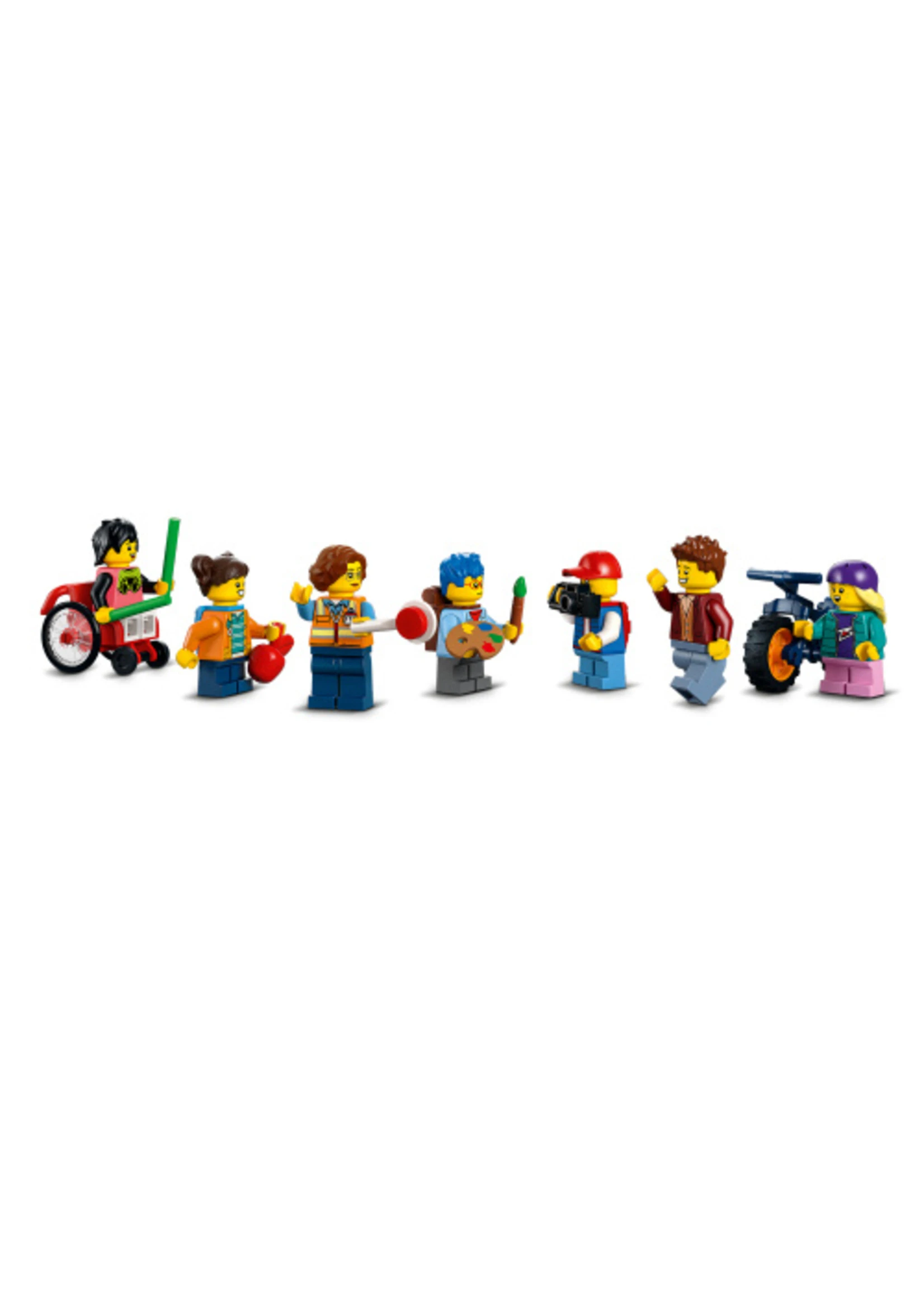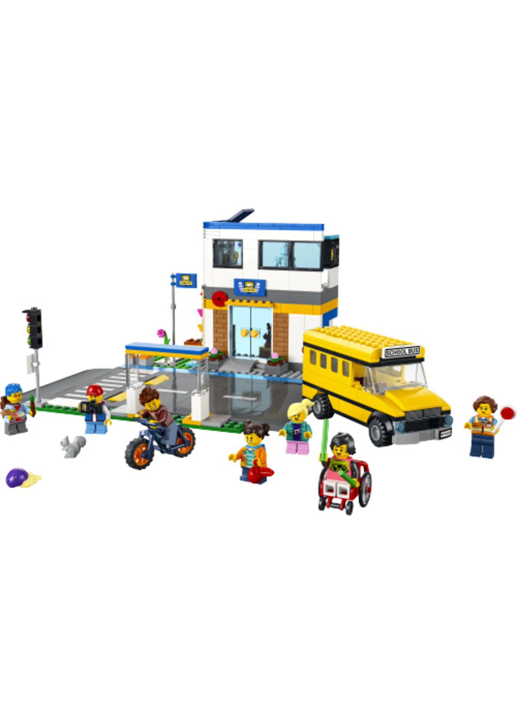 - What’s in the box? – All kids need to build a 2-level school building with schoolyard, toy school bus, bus stop, bike and 7 minifigures, including 2 LEGO® City TV characters, plus a squirrel figure