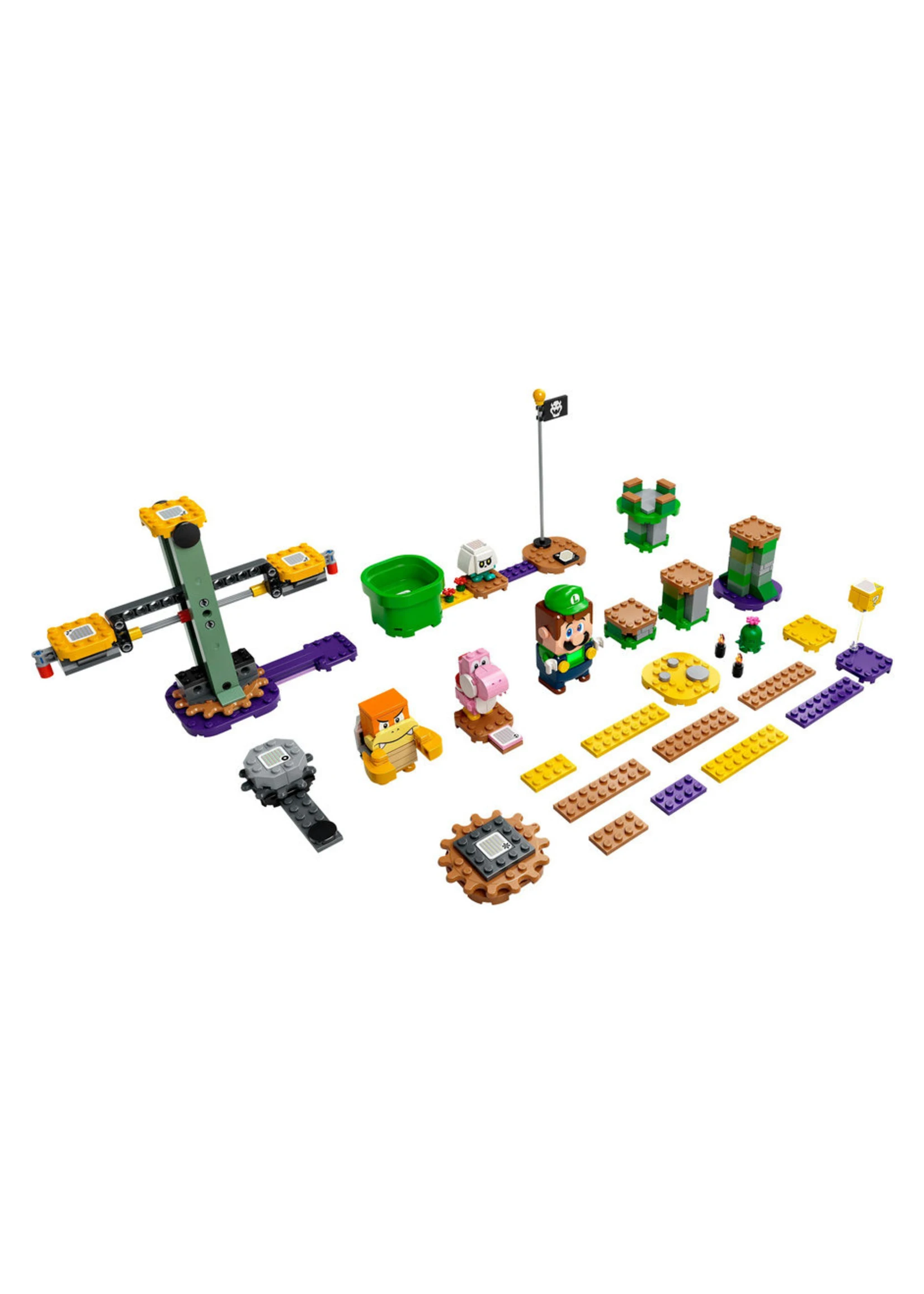 - Move LEGO® Luigi⢠from Start Pipe to Goal Pole, collecting digital coins for spinning seesaw and flying challenges and interacting with the ? Block and Pink Yoshi, Boom Boom and Bone Goomba figures.