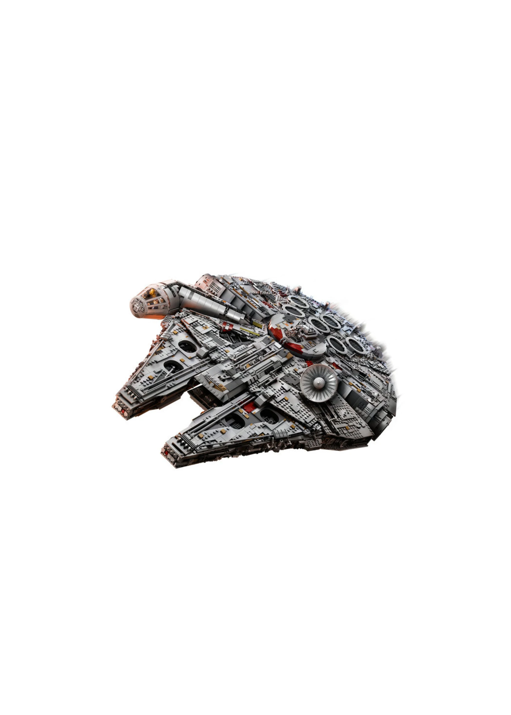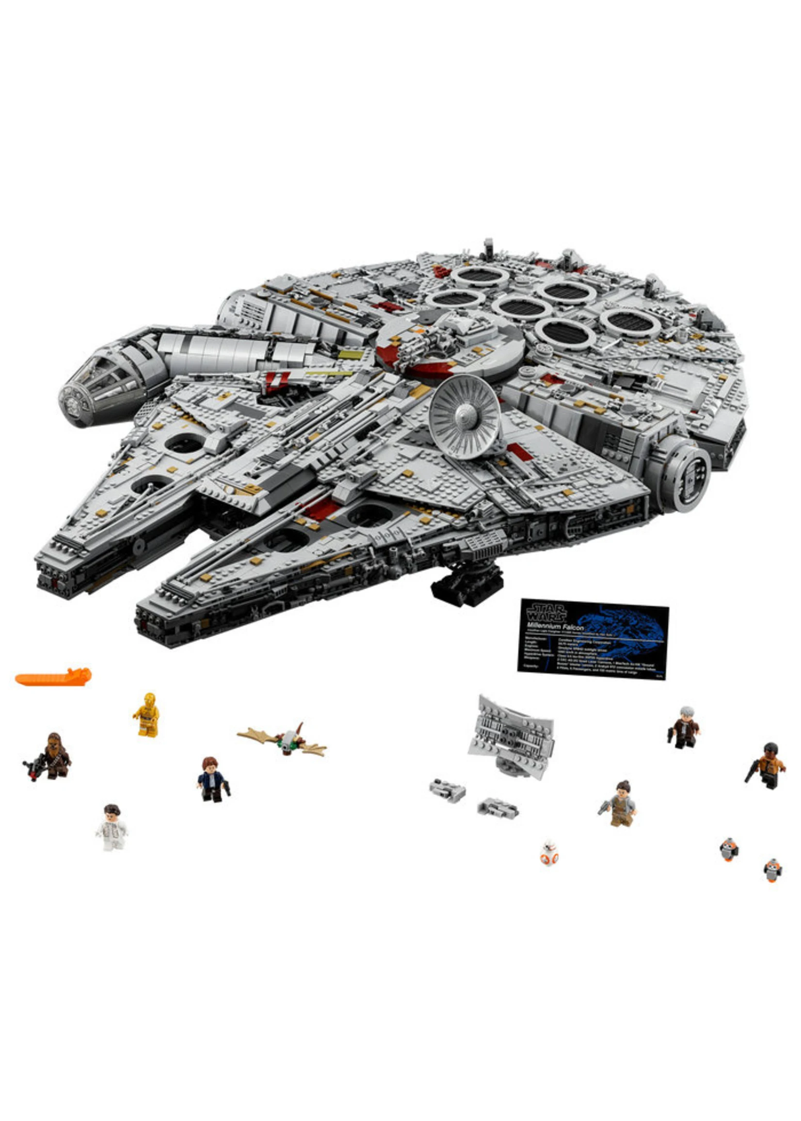Welcome to the largest, most detailed LEGO® Star Wars Millennium Falcon model we’ve ever created—in fact, with 7,500 pieces it’s one of our biggest LEGO models, period! This amazing LEGO interpretation of Han Solo’s unforgettable Corellian freighter has all the details that Star Wars fans of any age could wish for, including intricate exterior detailing, upper and lower quad laser cannons, landing legs, lowering boarding ramp and a 4-minifigure cockpit with detachable canopy. Remove individual hull plates to reveal the highly detailed main hold, rear compartment and gunnery station. This amazing model also features interchangeable sensor dishes and crew, so you decide whether to play out classic LEGO Star Wars adventures with Han, Leia, Chewbacca and C-3PO, or enter the world of Episode VII and VIII with older Han, Rey, Finn and BB-8!