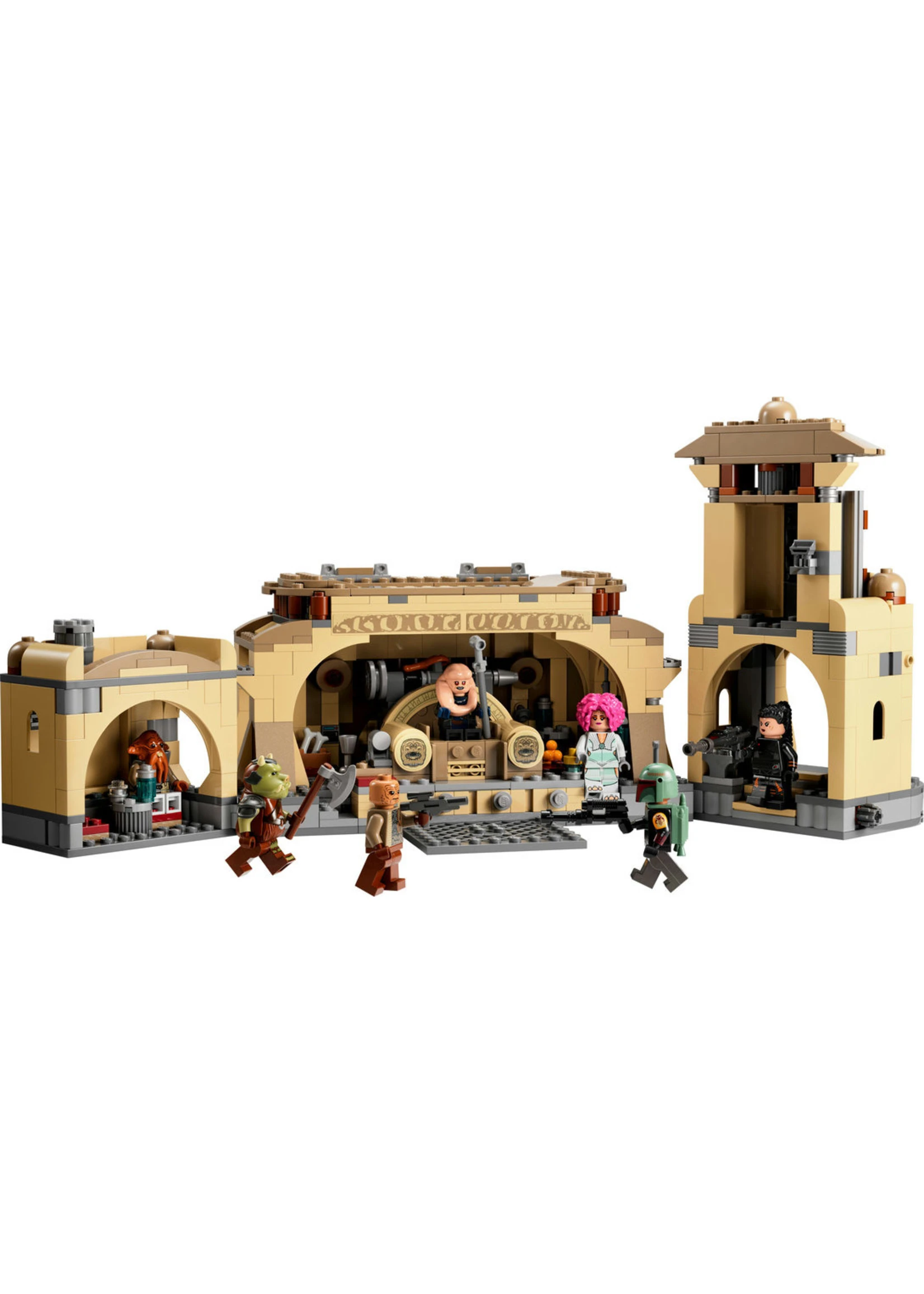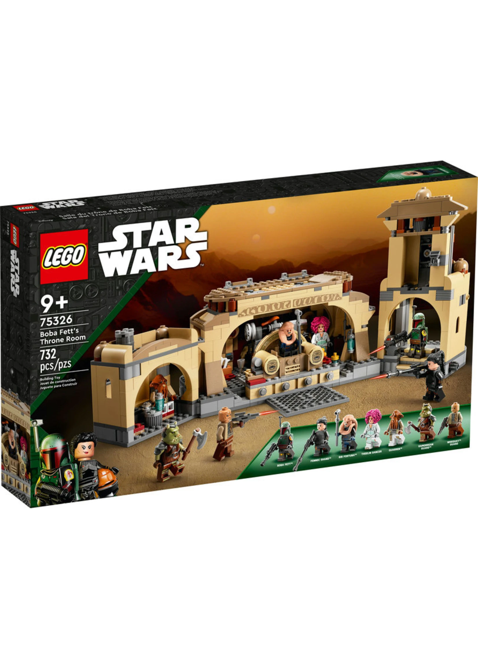 Write new chapters in the Star Wars: The Book of Boba Fett saga with this Boba Fett’s Throne Room buildable playset (75326) for fans aged 9 and up. The brick-built palace model opens up for easy access to the detailed throne room, barbecue area and kitchen. There is a throne with a hidden treasure compartment and a pop-up function to eject Bib Fortuna, tilting steps, an opening gate and lots of playful accessories.