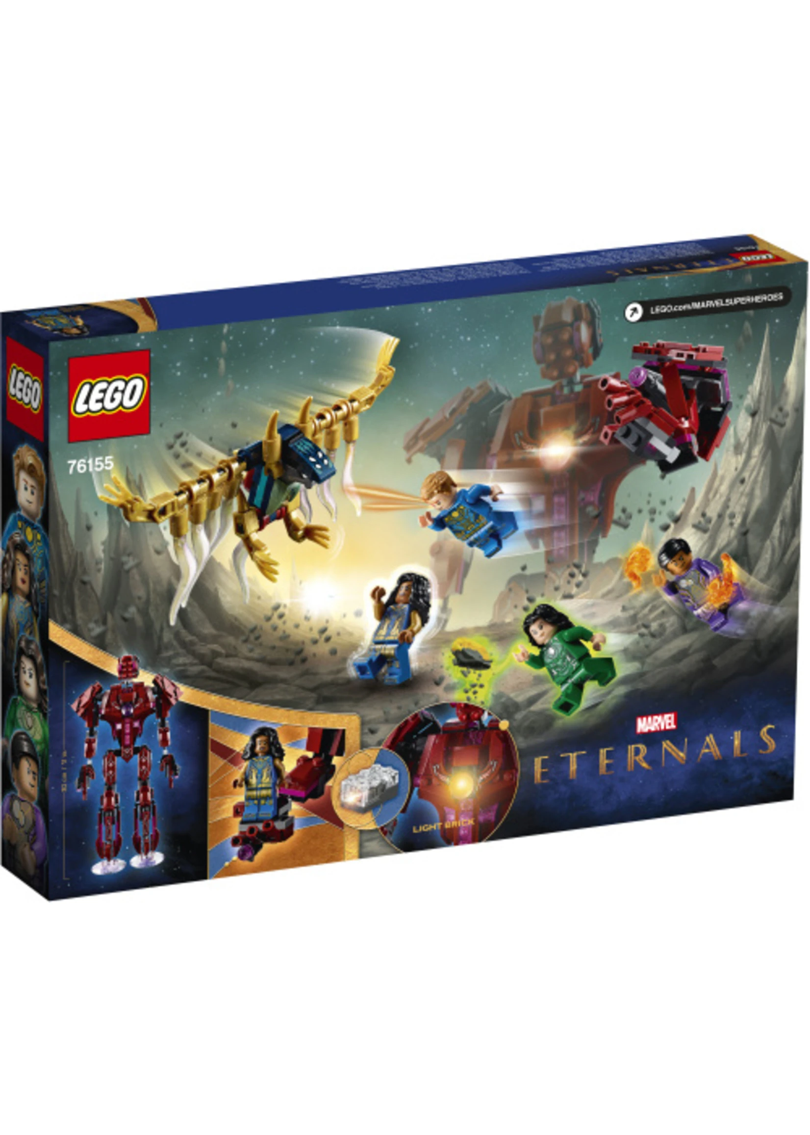 - Includes 4 Eternals superhero minifigures – Ikaris, Sersi and exclusive Ajak and Kingo – a Deviant figure, a posable Celestial with a light-up chest, 2 daggers, 1 sword, 2 mini shooters and a blade.