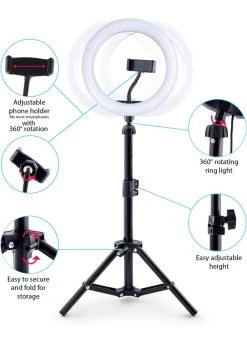Take your videos to the next level! Customize your background and lights to make your own unique vlogs, reviews, tutorials, music videos and more. Great for parties too! Includes adjustable tripod, 59×70″ green screen, 12-mode LED ring light with USB power supply, smartphone holder, 118″ USB cable, plus power and brightness controller. Remember, privacy and safety are top concerns, so follow age guidelines and regulations when using social media!