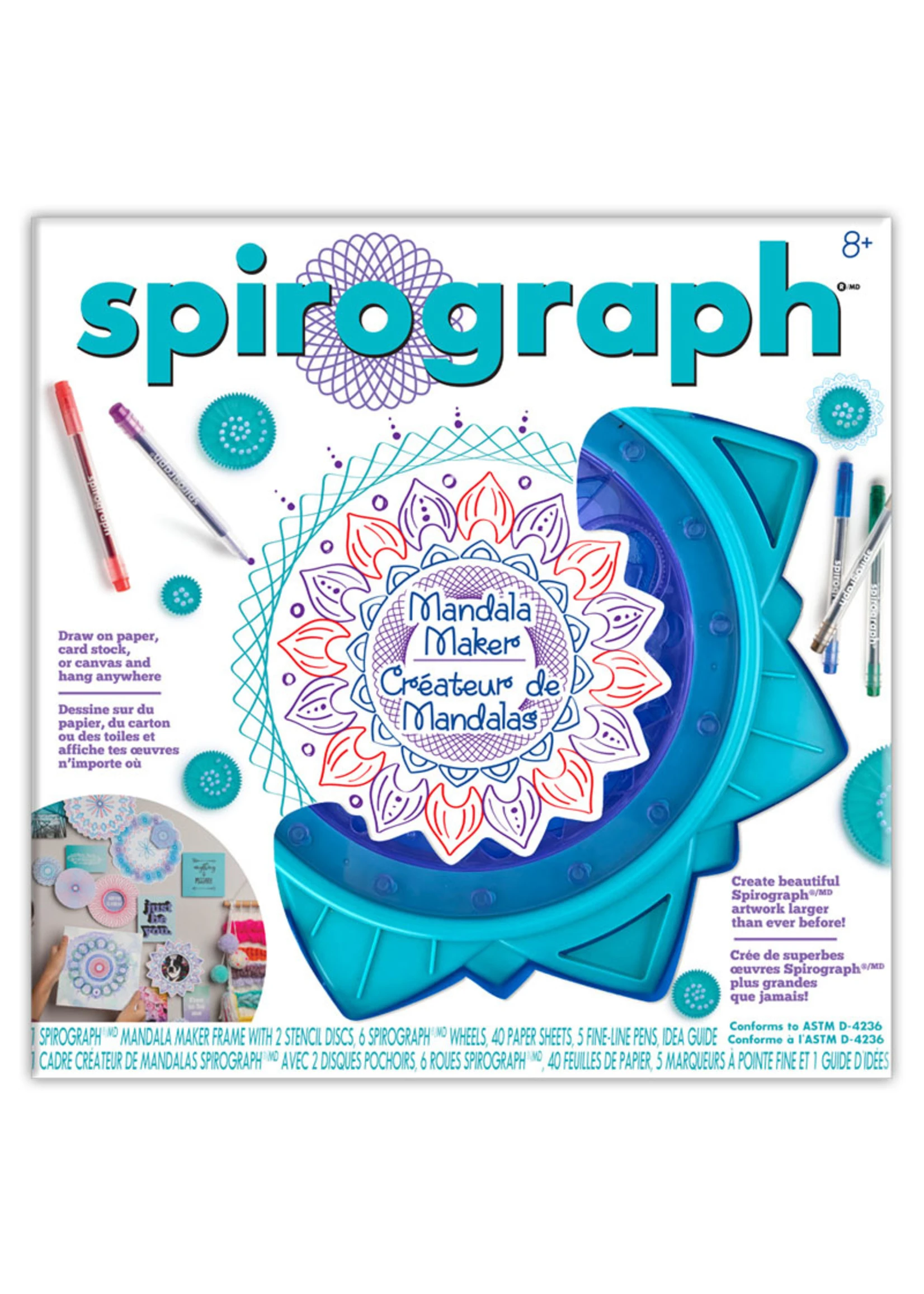 Create stunning mandala designs with a Spirograph twist using Spirograph Mandala Maker! Just slide your paper into the frame, click in one of the interchangeable wheels, and start drawing to create beautiful Spirograph designs. Then use the stencils to add countless mandala patterns. Mandala Maker is large to allow for many designs, and can easily be drawn on card stock or canvas (not included) for displaying your fabulous artwork!