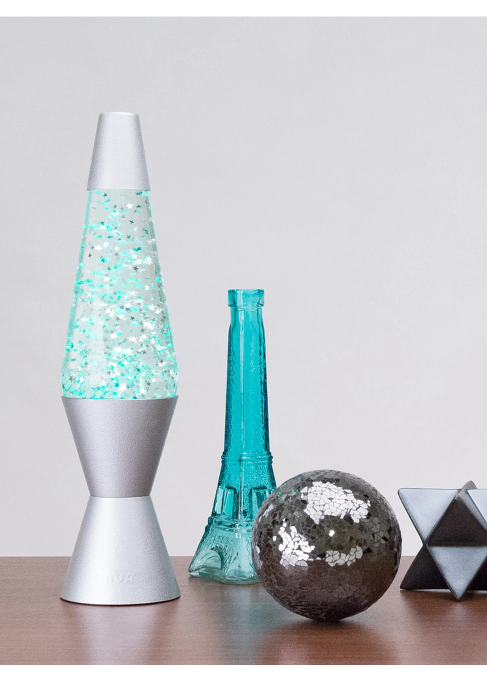 LAVA® Lamps have continued to captivate for over 50 years. It has one of the most recognized, trademarked shapes of all time. LAVA® glitter Lamps produce a soft warm light and mesmerizing visuals of gently swirling, silver star glitter sparkling in the clear liquid. Silver star glitter / blue liquid / silver base & cap. Aluminum base. Plugs into a power outlet. Provides relaxing, soft light. Instant start-up action.