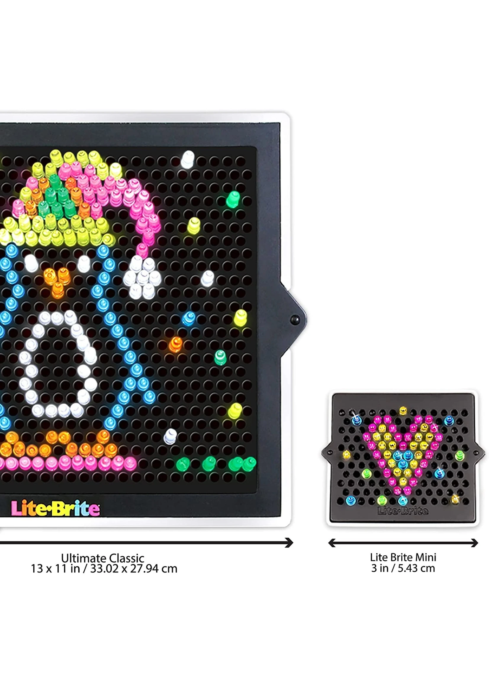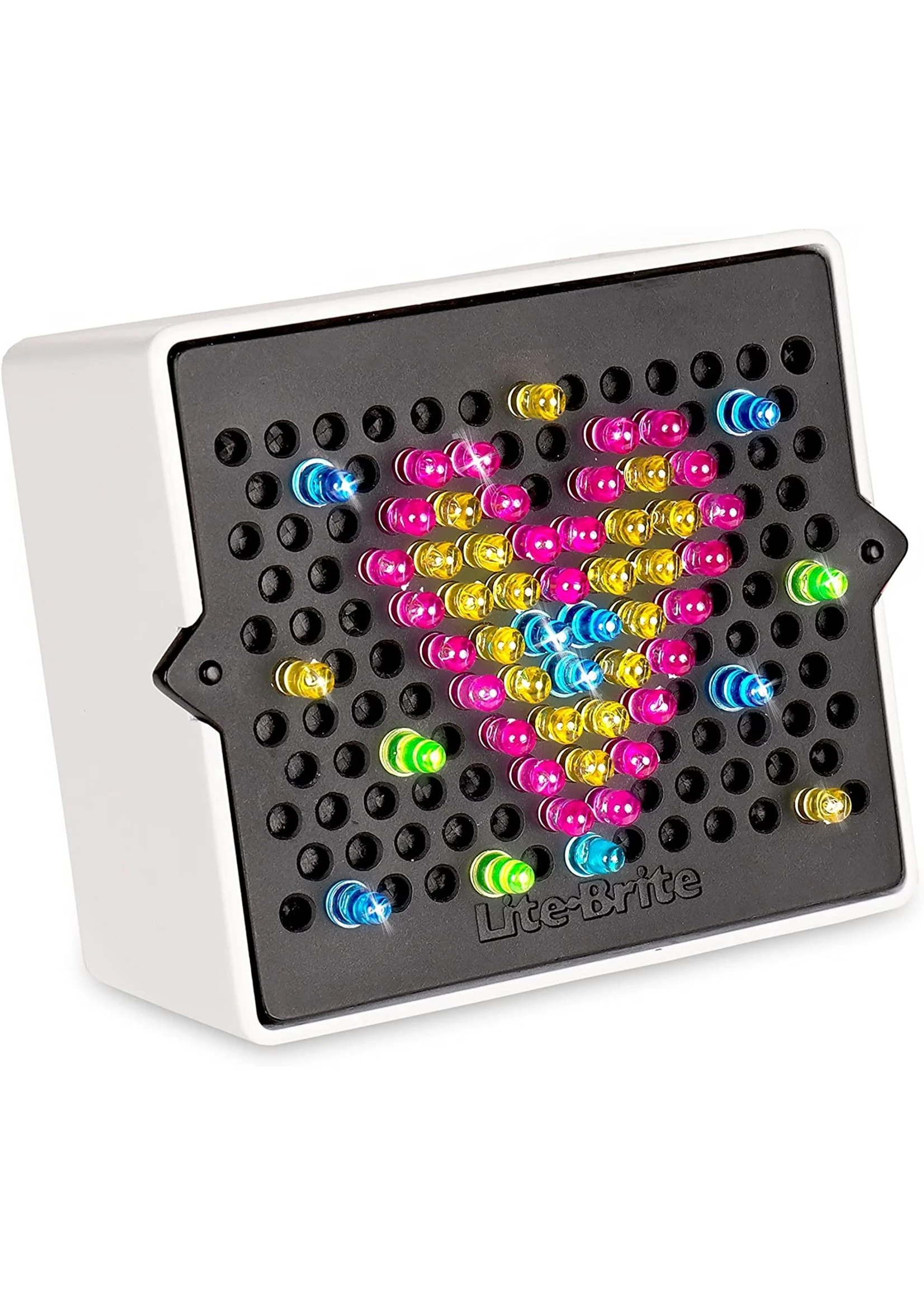 Everyone’s favorite Lite-Brite is now in miniature form! Create art with light using Lite-Brite – the fun and nostalgic toy in a new, miniature version! Inspired by the classic 1980’s Lite-Brite toy, this Lite-Brite Mini includes 4 design templates, 70 colorful mini pegs and a screen that measures 3. 5″ wide by 3″ high. Create beautiful art using templates or your own imagination with colorful mini pegs, then light up the screen for a fun display of your artwork! Great for travel and on-the-go!